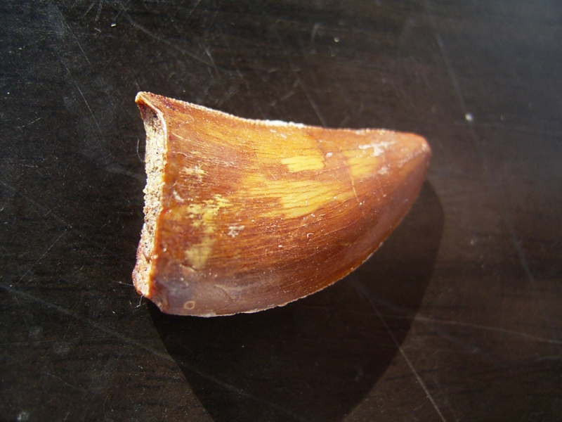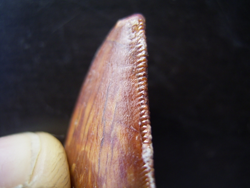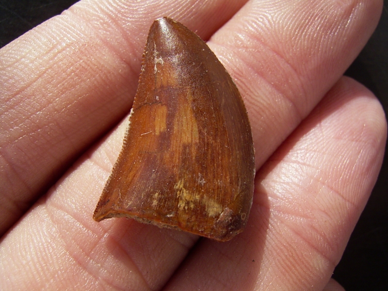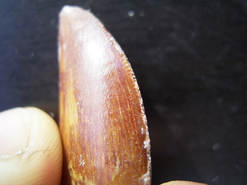 Der Zahn ist komplett erhalten und misst etwa 2,4 cm. Die für Fleischfresser typischen Sägekanten sind beidseitig sehr gut erhalten.