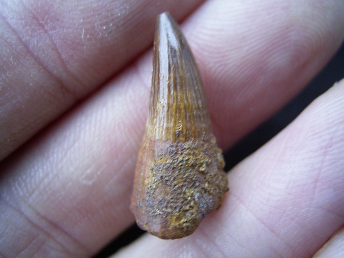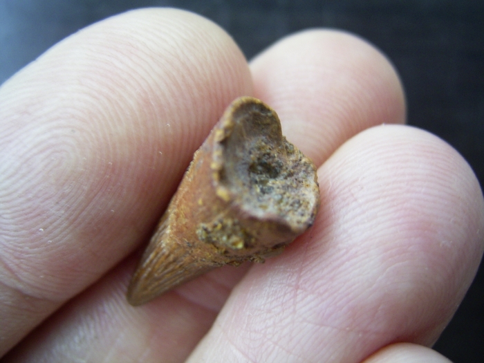 Das Fossil misst etwa 2,3 cm und ist komplett erhalten von der Wurzel bis zur Spitze.