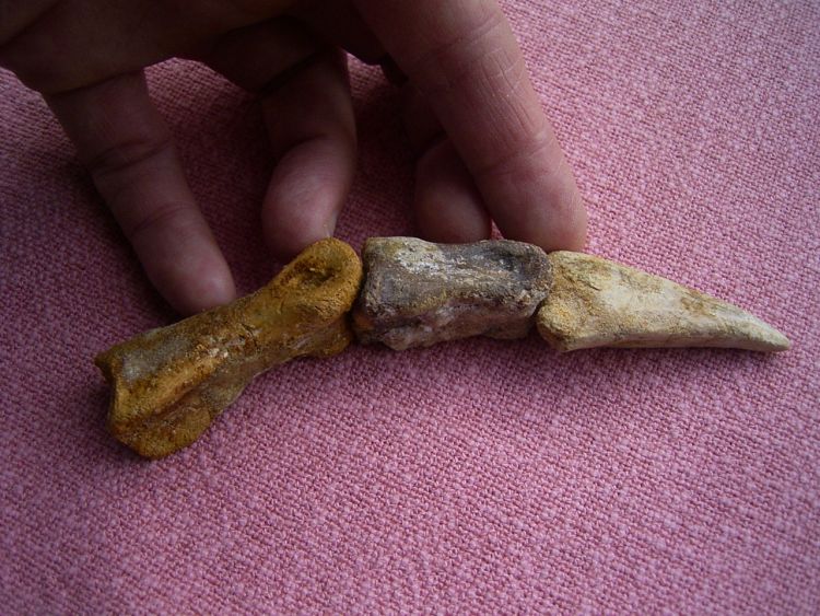 Hier handelt es sich um die Kralle und zwei Fingerknochen des Dinosauriers Spinosaurus aus der Kreide von Taouz, Marokko.