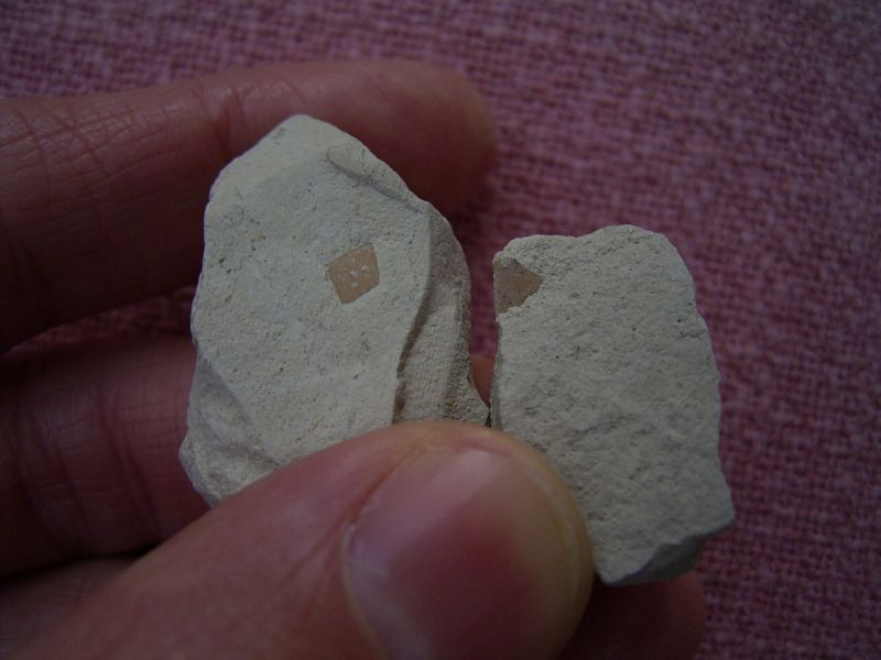 Diese beiden kleinen Steine enthalten Vogel-Eierschalen von Palaeolodus. Sie stammen aus dem Oligozaen und sind etwa 27 Mio. Jahre alt.