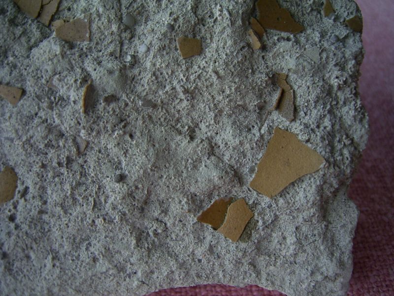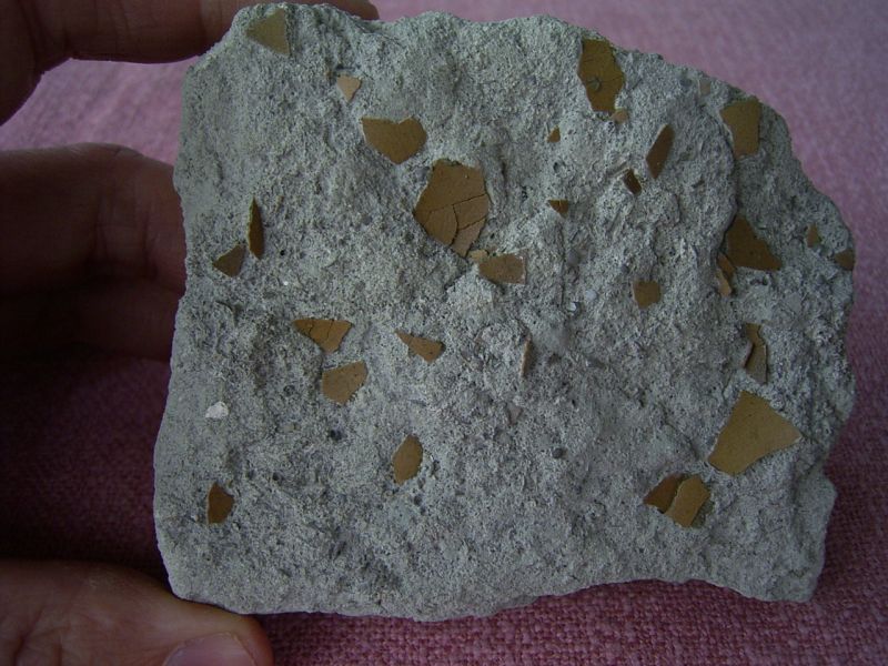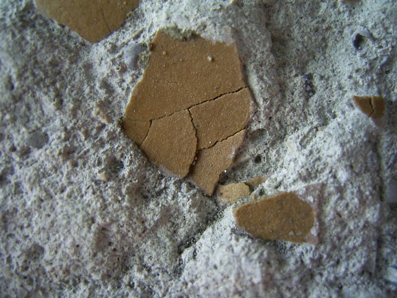 Dieses Handstück mit Schalenstücken von unbestimmten Vögeln stammt aus dem Oligozän von Gandaillat in Frankreich.