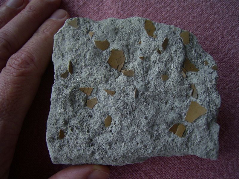Der Stein ist ungebrochen, er misst etwa 10 x 8 x 3 cm. Er ist gespickt mit Schalenresten, auch auf der Rückseite sind einige Fossilien zu erkennen.