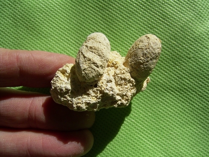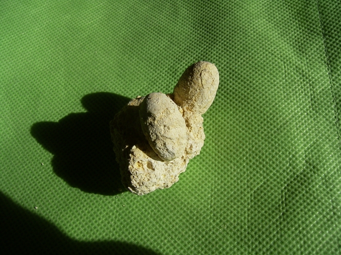 Diese Eidechsen-Eier (Squamaturum ovum) stammen aus dem Brackwasserkalk (Corbicula-Schichten) von Grünstadt. Zum Alter: unteres Miozän ( Aquitan). Ein Vergleich der Eidaten mit rezenten Eiern legt nahe, dass es sich wahrscheinlich um Schlangen-Eier handelt.