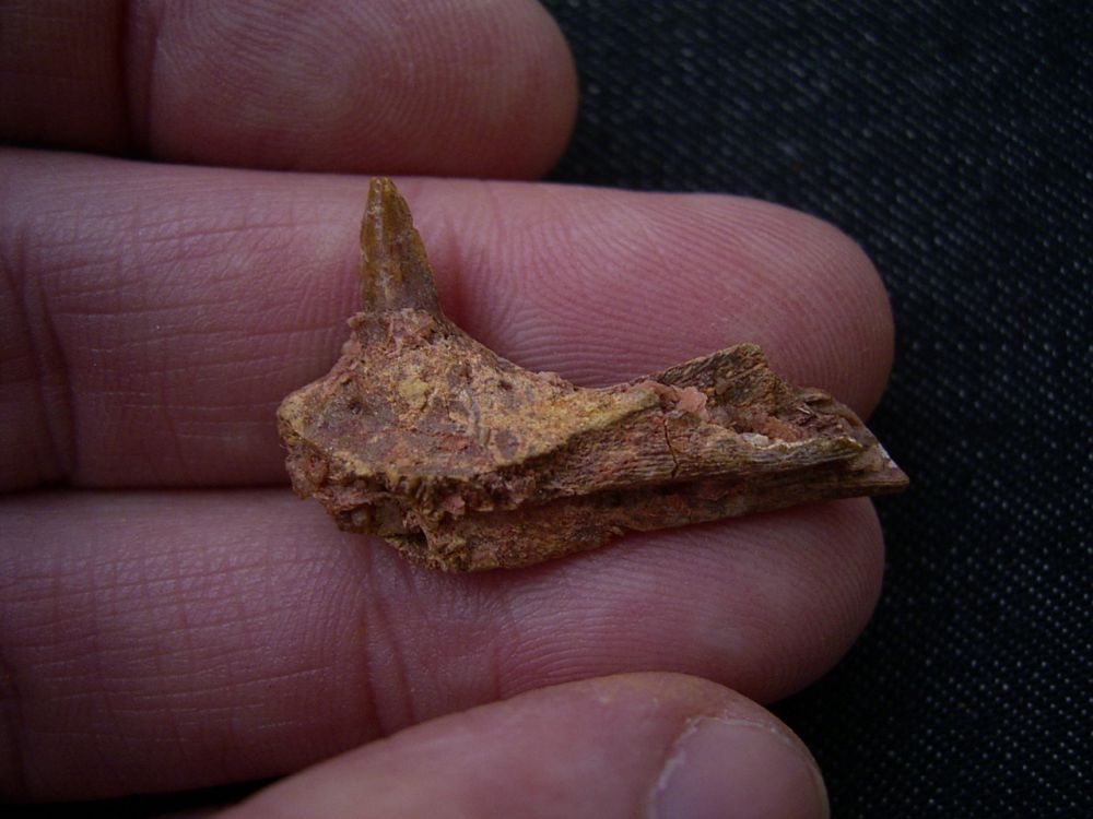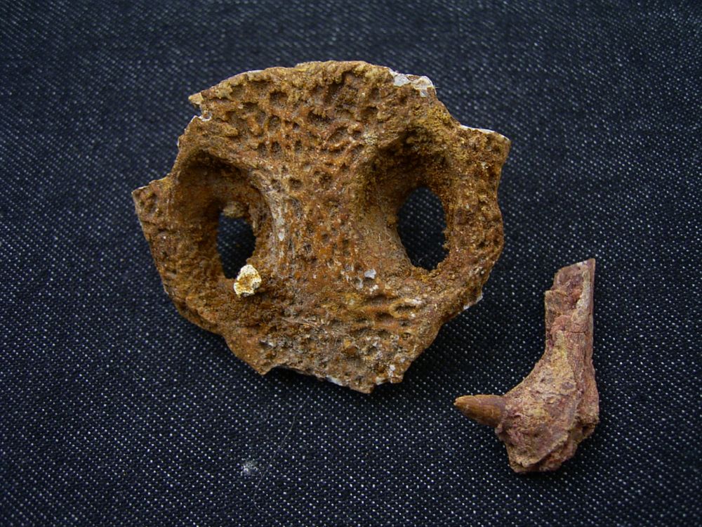 Hier handelt es sich um ein Schädelteil und einen Unterkiefer-Ast mit Zahn eines jungen (juvenilen) Krokodils. Die Fossilien stammen aus den kreidezeitlichen Sedimenten von Taouz, Marokko.