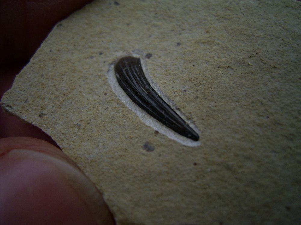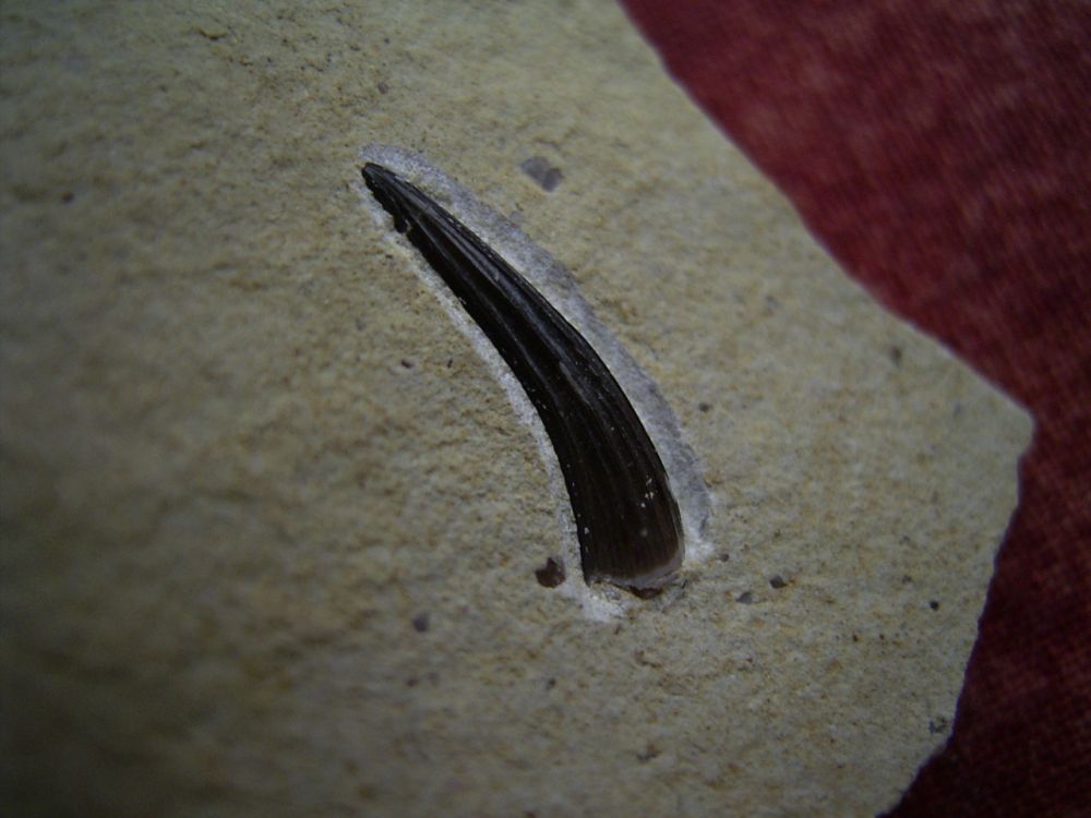 Dieser Zahn von Nothosaurus stammt aus dem untern Muschelkalk (Orbicularis Schicht) von Farnstädt.