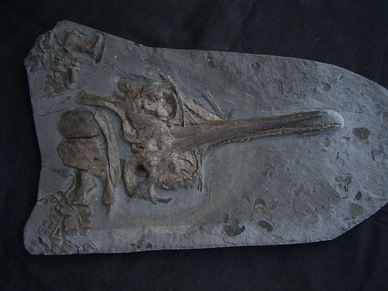 Die Platte misst etwa 75 x 47 cm. Der Schädel alleine misst etwa 43 cm. Er ist schön dreidimensional erhalten und erhebt sich etwa 3 cm aus der Platte (das kommt auf den Bilder leider nicht so gut zur Geltung). Leider sind kaum noch neue Funde aus Holzmaden zu erwarten, da die meisten der Steinbrüche dort mittlerweile den Betrieb eingestellt haben.