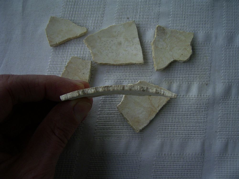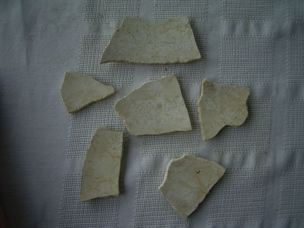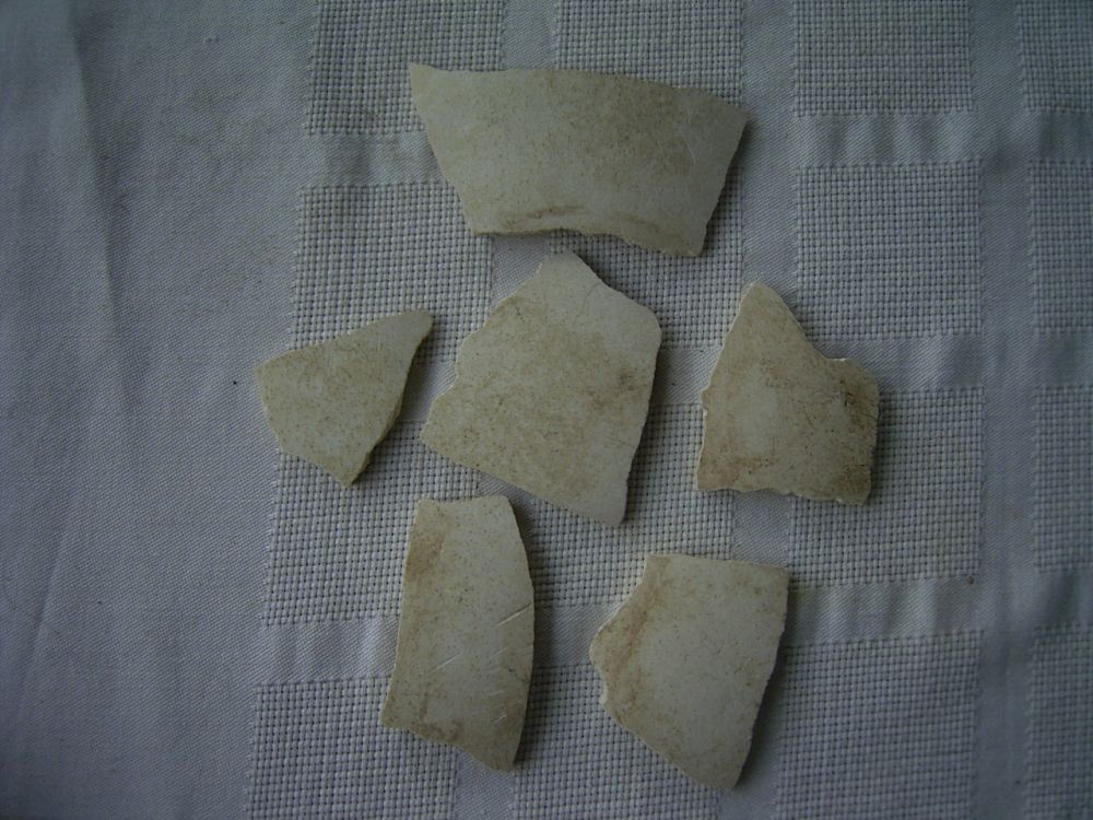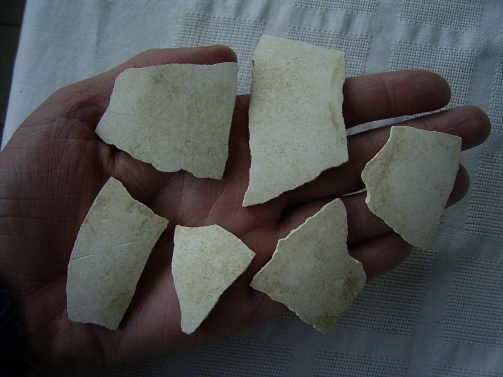 Bei diesen sechs Schalenstücken handelt es sich um Originale, sie sind ungerbochen und ohne Ergänzungen. Das größte Stück misst etwa 7 x 3,5 cm.