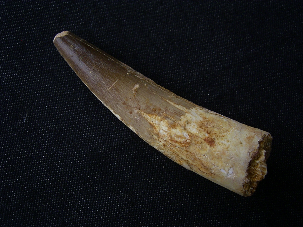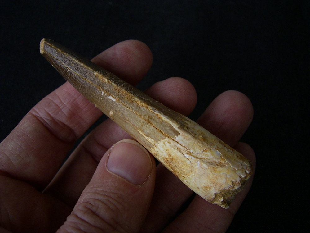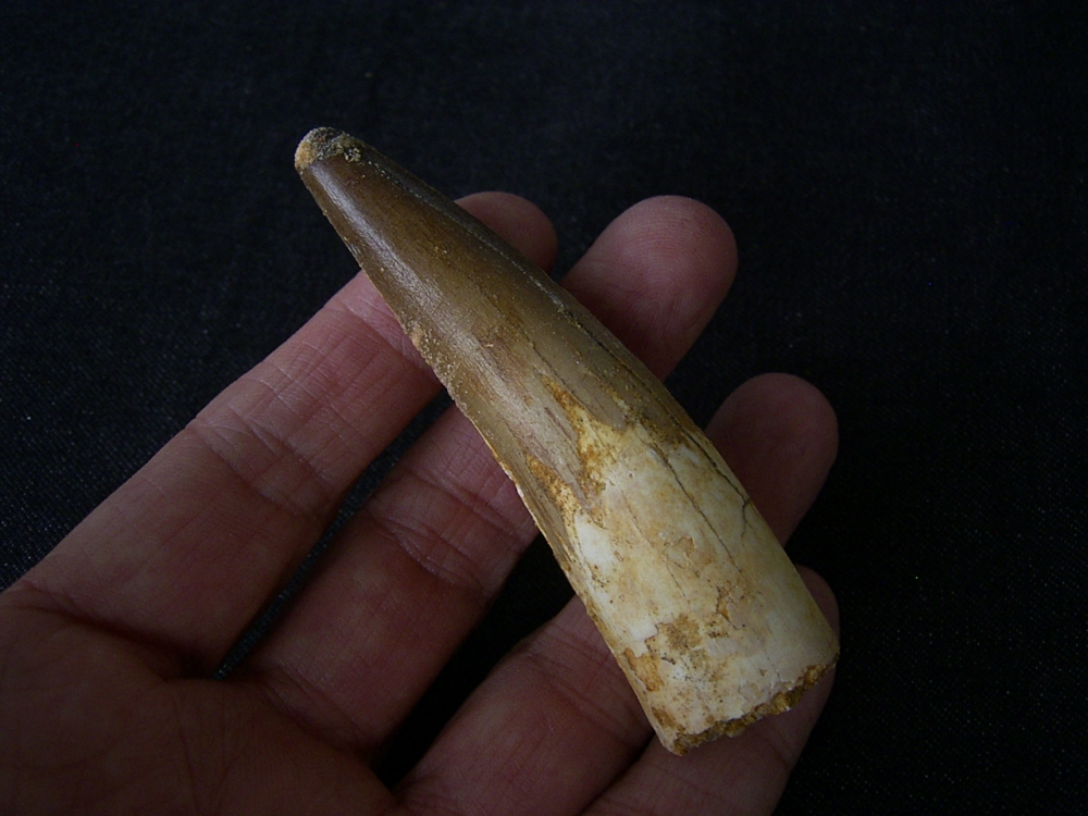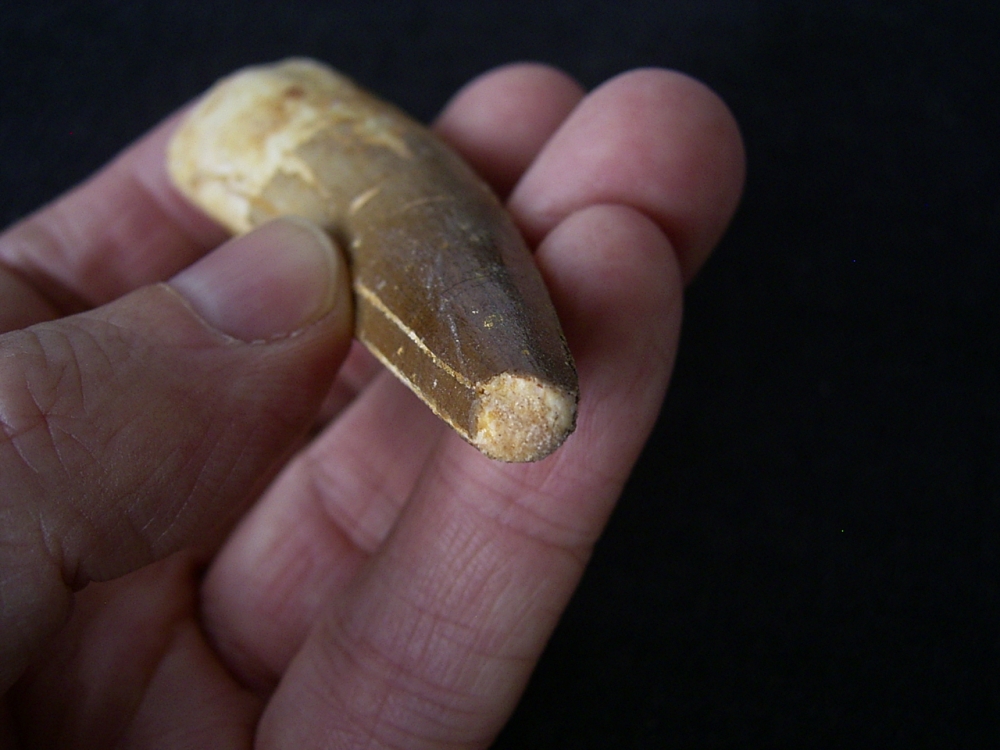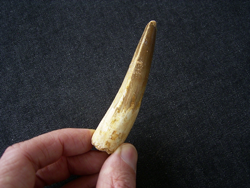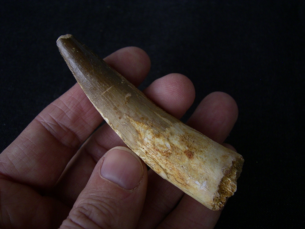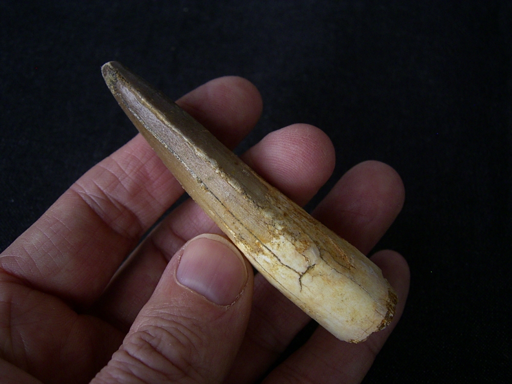 Dieser Zahn ist etwa 9 cm lang, die Basis hat einen Durchmesser von etwa 2,5 cm.