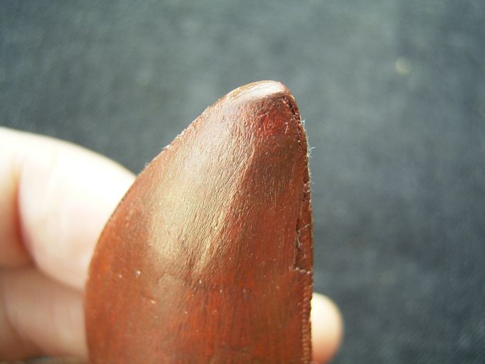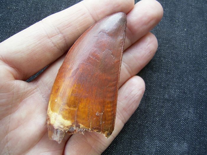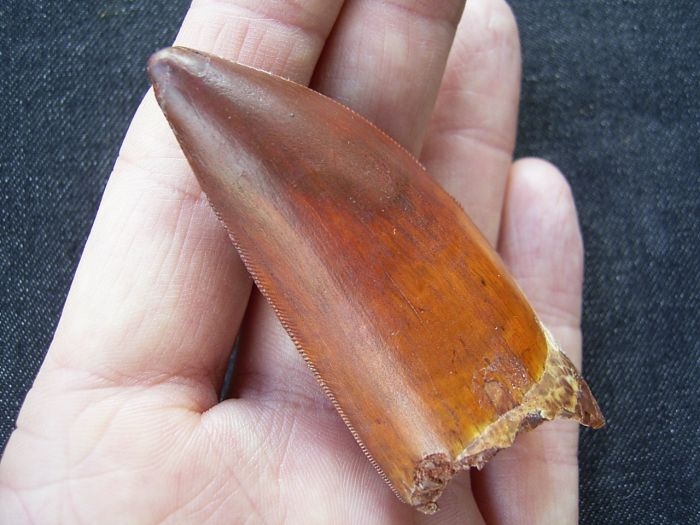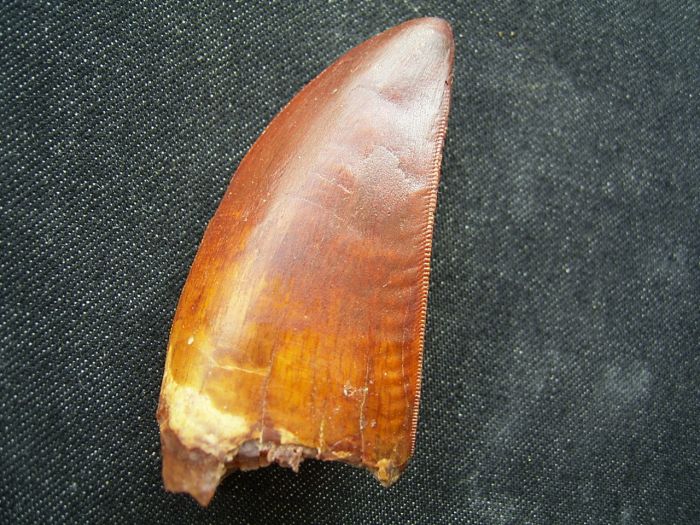 Er ist komplett und perfekt erhalten. Deutlich zu erkennen sind die für diesen Fleischfresser typischen Sägekanten.