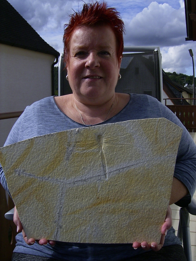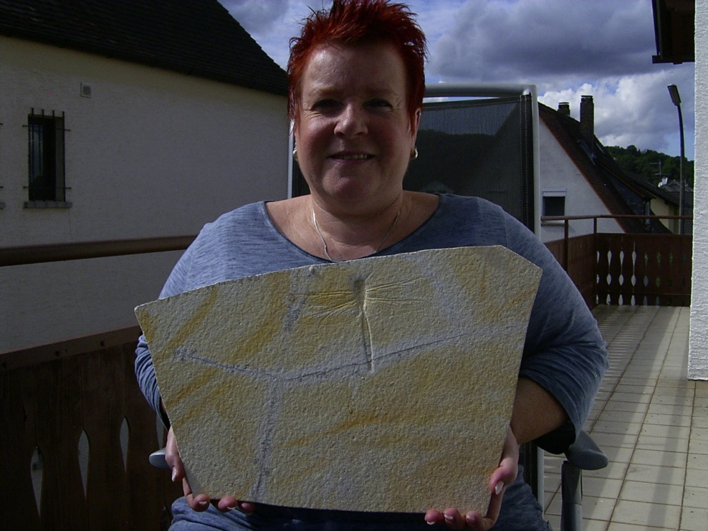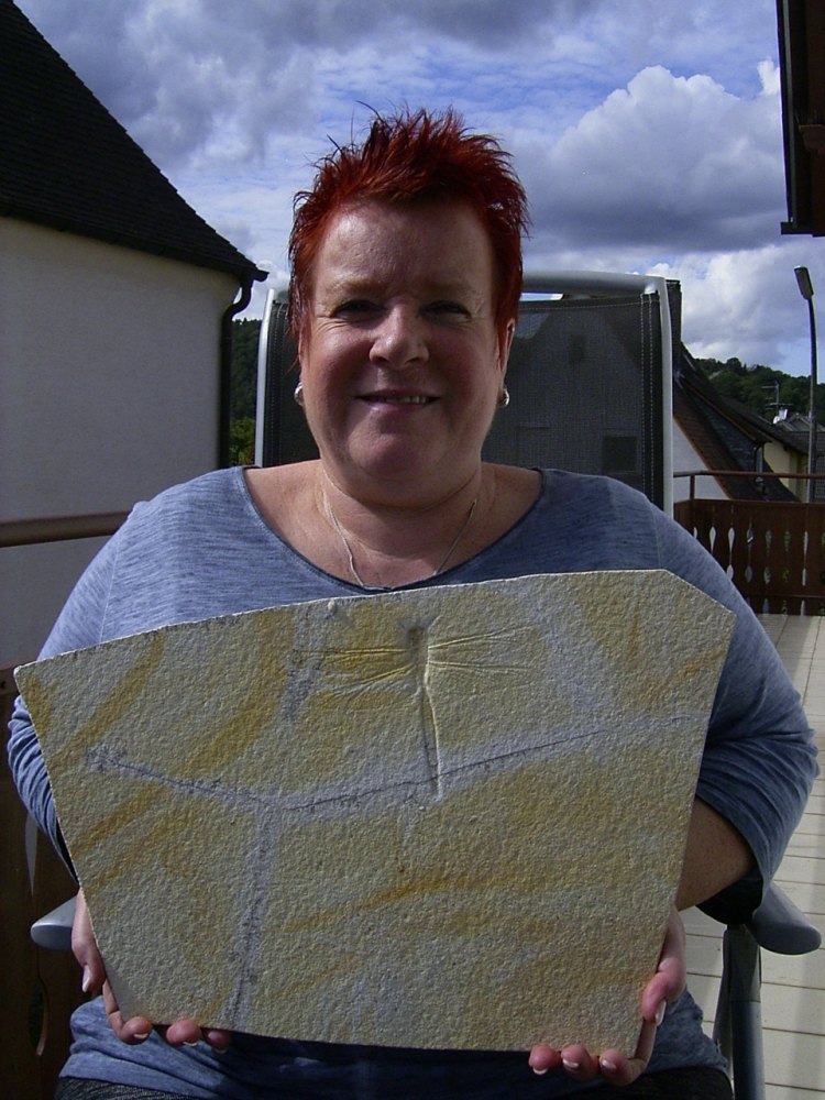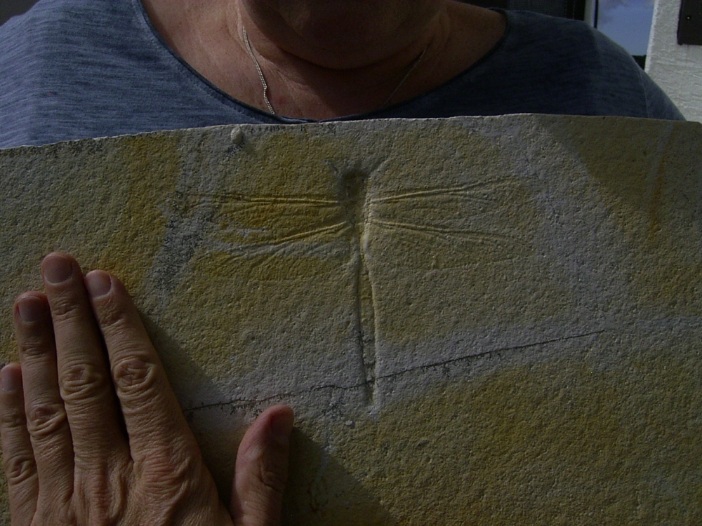 An der Libelle wurde nichts ergänzt oder coloriert. Das Fossil wurde zum Schutz mit einem feinen, nicht glänzenden Lack versehen. Die Platte war gebrochen, sie wurde professionell verklebt. Der Stein misst etwa 46 x 30 x 1 cm.