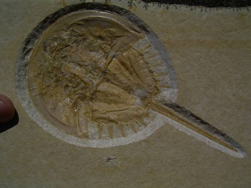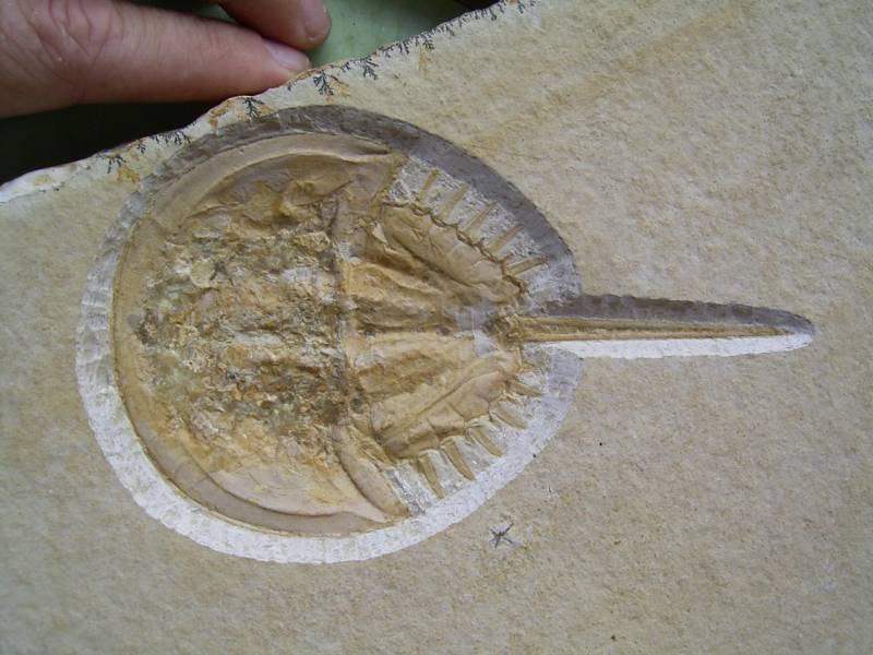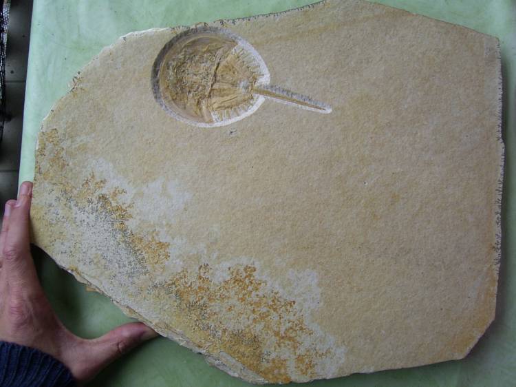 Dieser Pfeilschwanzkrebs (Mesolimulus walchi) stammt aus dem oberen Jura (Malm zeta) von Eichstätt. Das Tier ist komplett erhalten. Die Qualität des Fossils und der Präparation ist hervorragend.