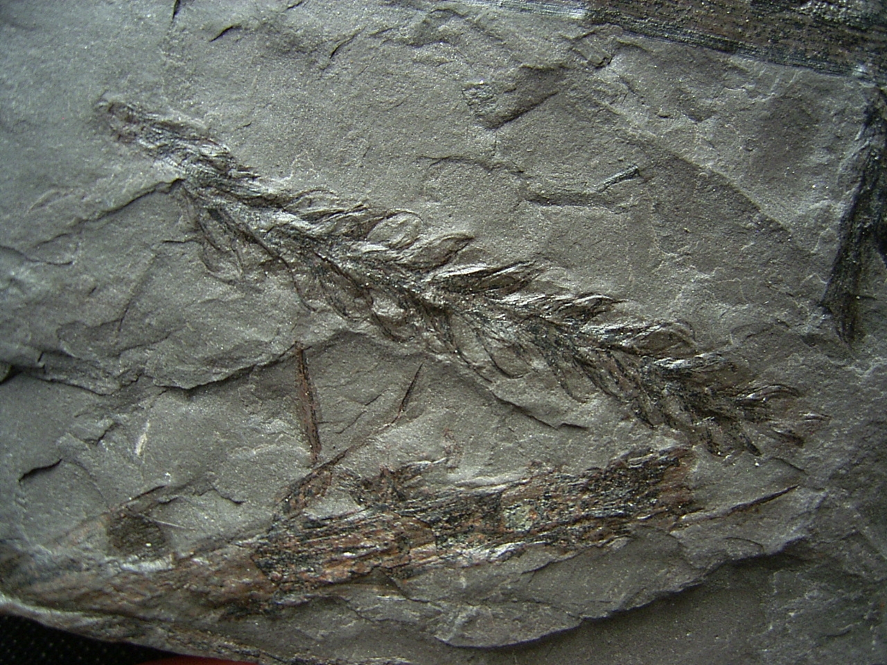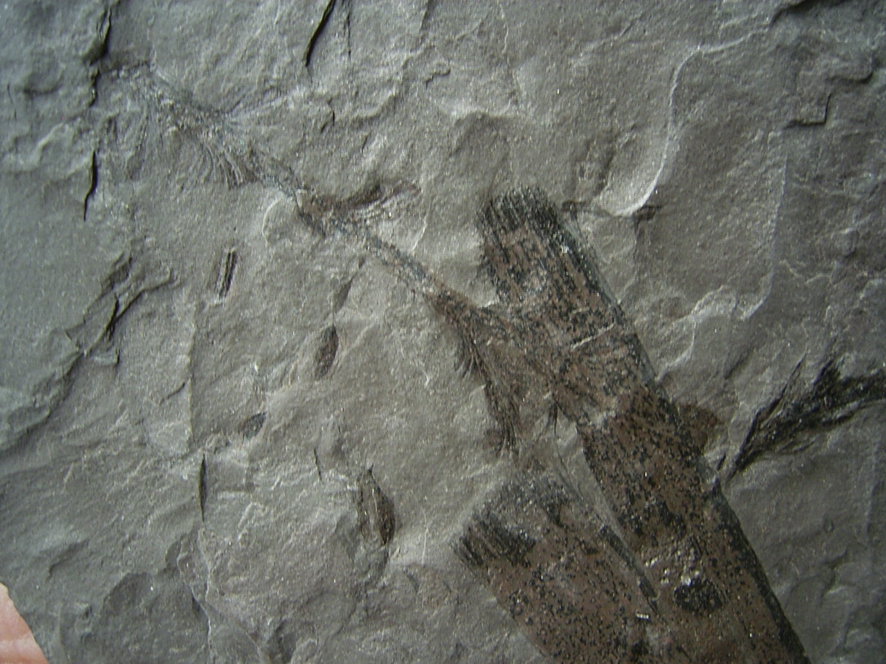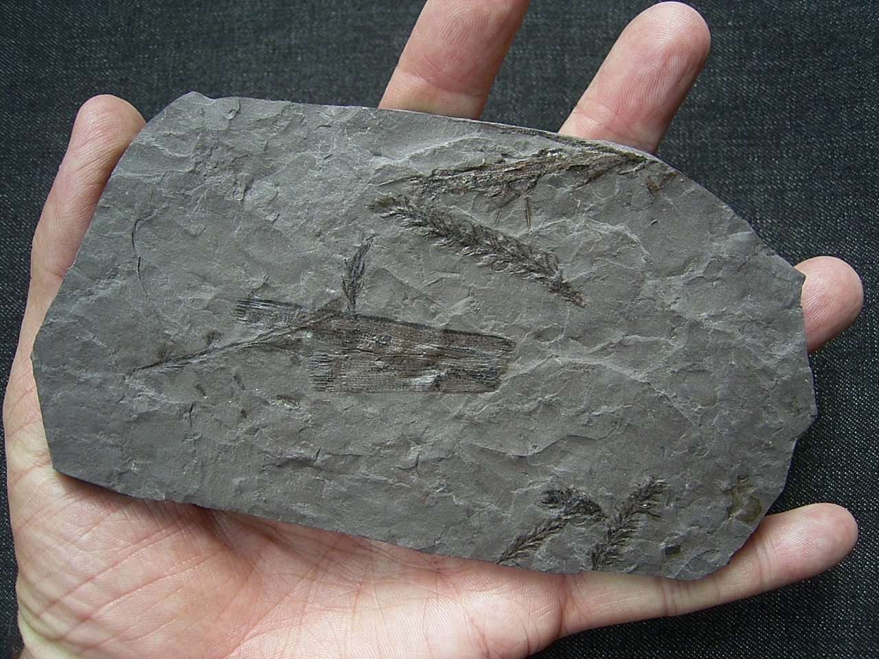 Der Stein ist ungebrochen, er enthält mehere Pflanzenfossilien vermutlich von Lebachia. Er misst etwa 15 x 8,5 cm.