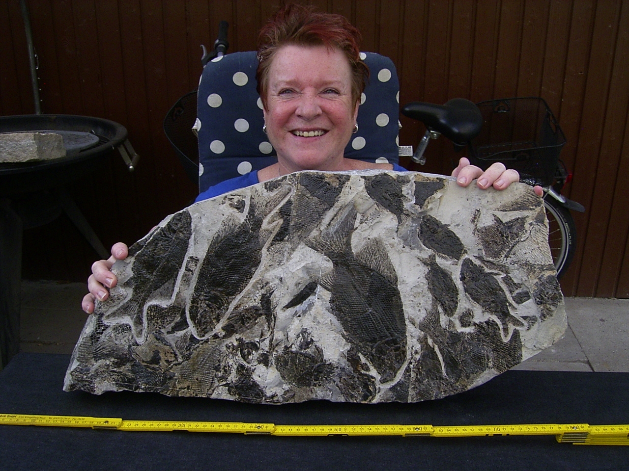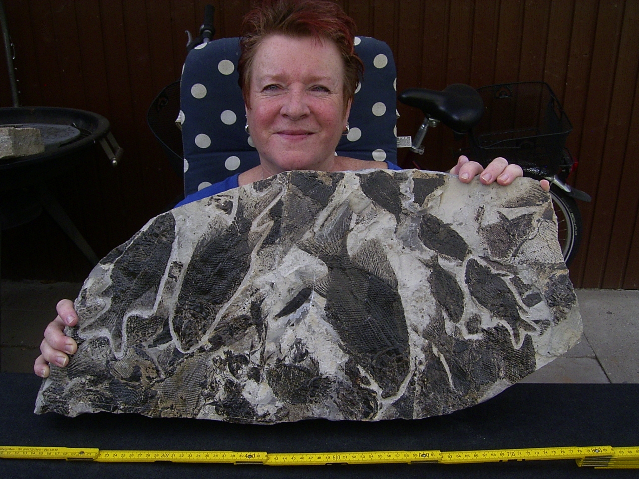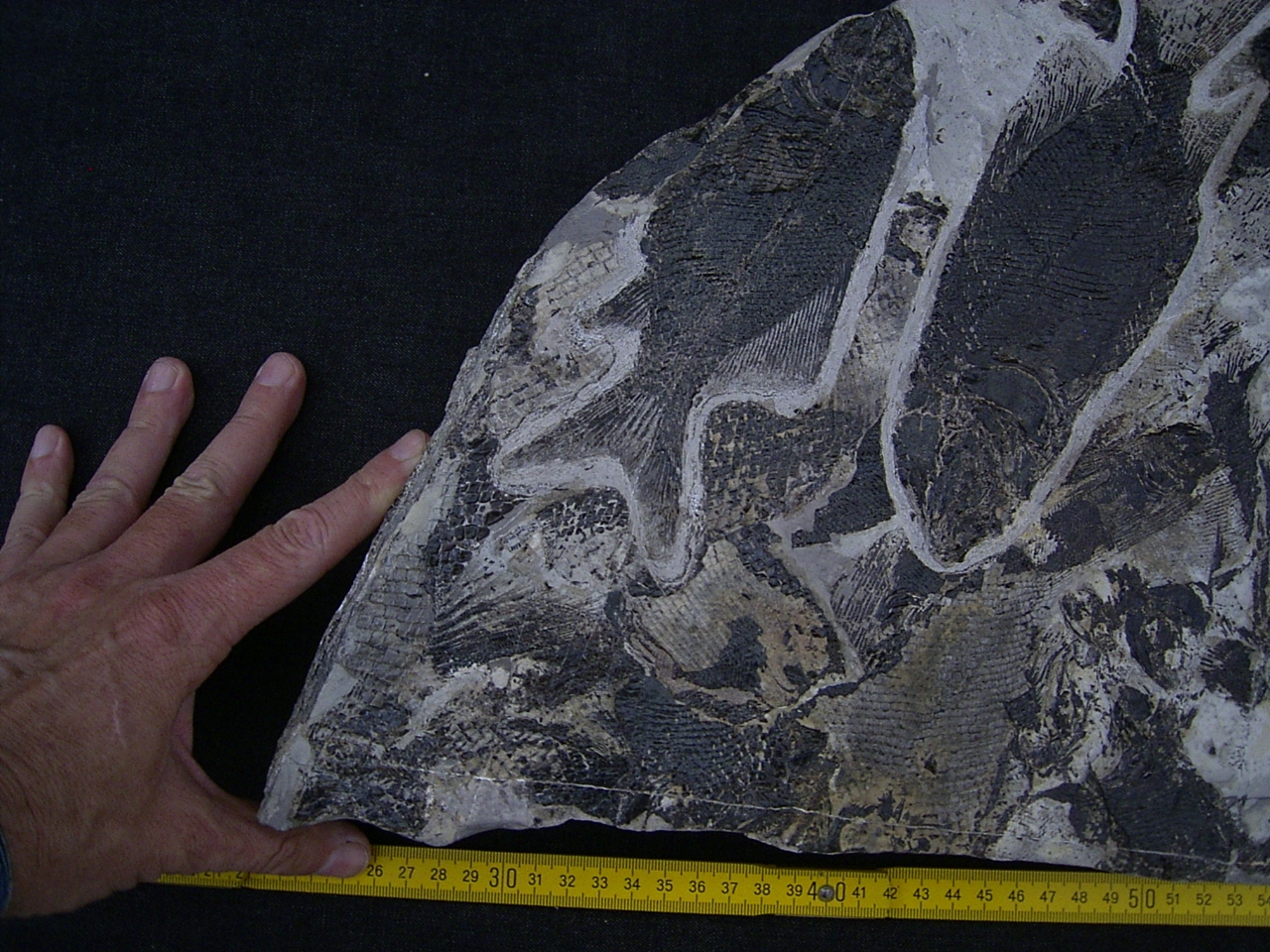 Der Stein ist gespickt voll mit Fischfossilien. Er ist ungebrochen, misst etwa 68 x 31 cm und hat eine Stärke von 5 cm. Er wiegt etwa 24 Kilogramm.