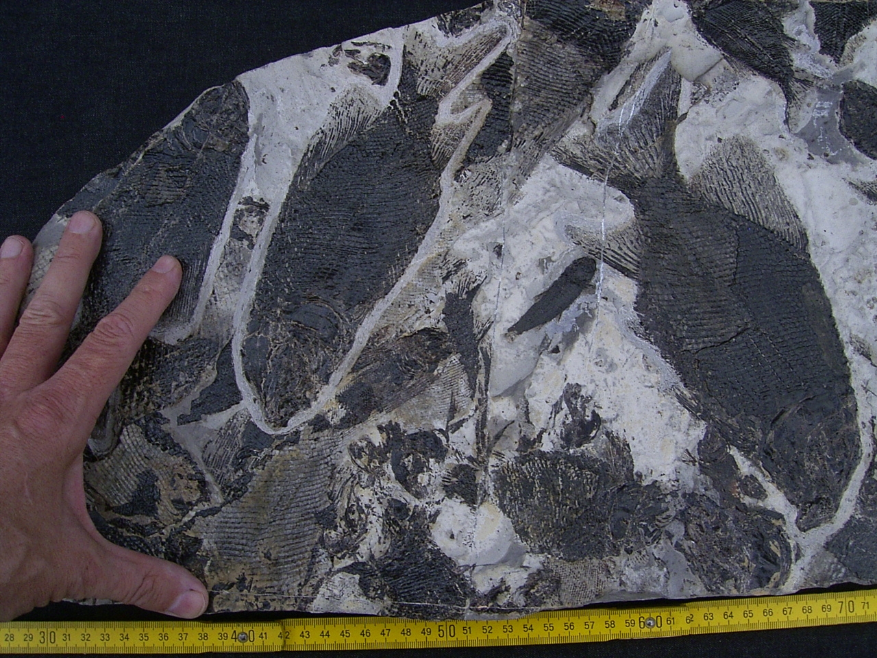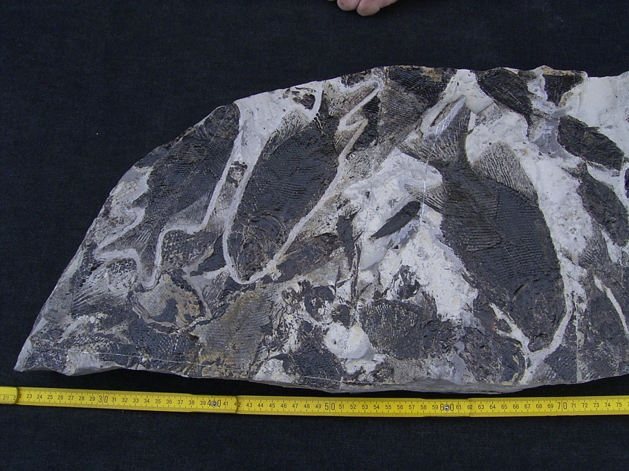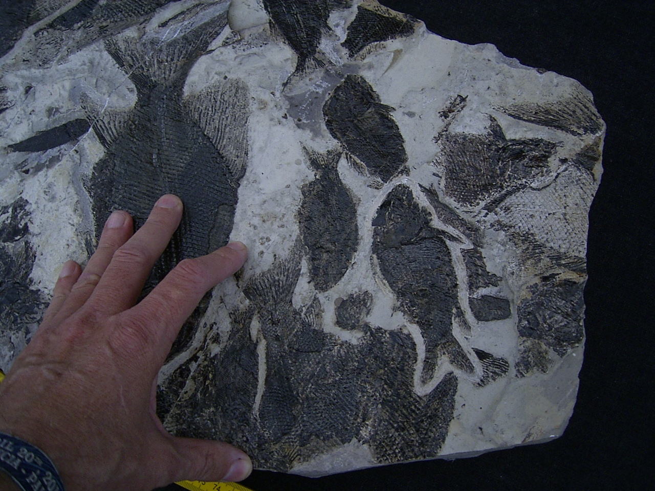 Der Stein ist gespickt voll mit Fischfossilien. Er ist ungebrochen, misst etwa 68 x 31 cm und hat eine Stärke von 5 cm. Er wiegt etwa 24 Kilogramm.