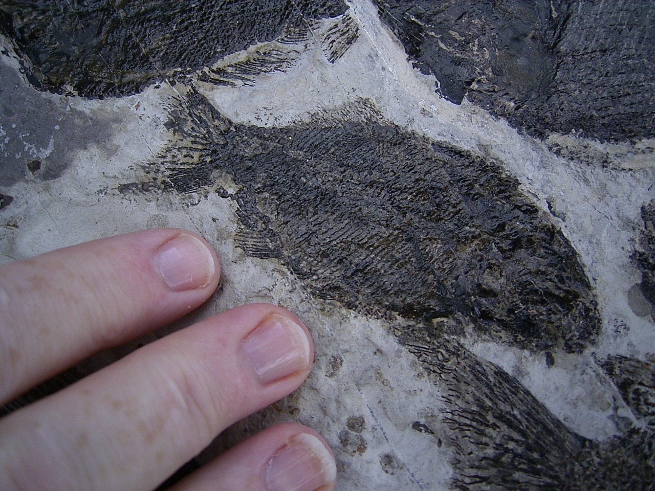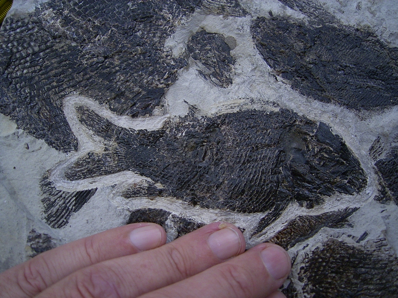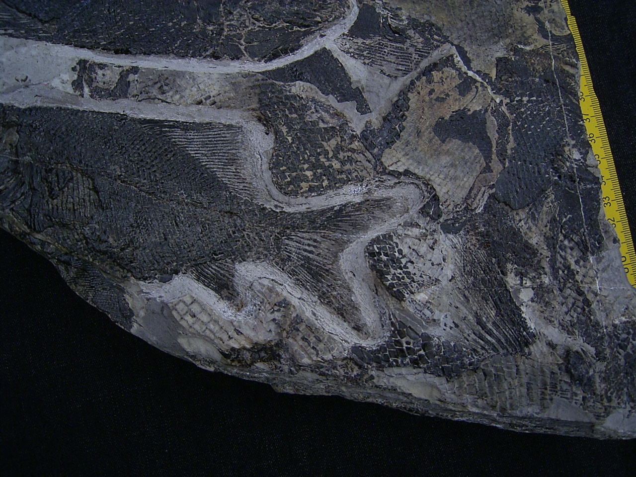Der Stein enthält mehrere Arten von Schmelzschuppenfischen (Strahlenflosser) darunter: