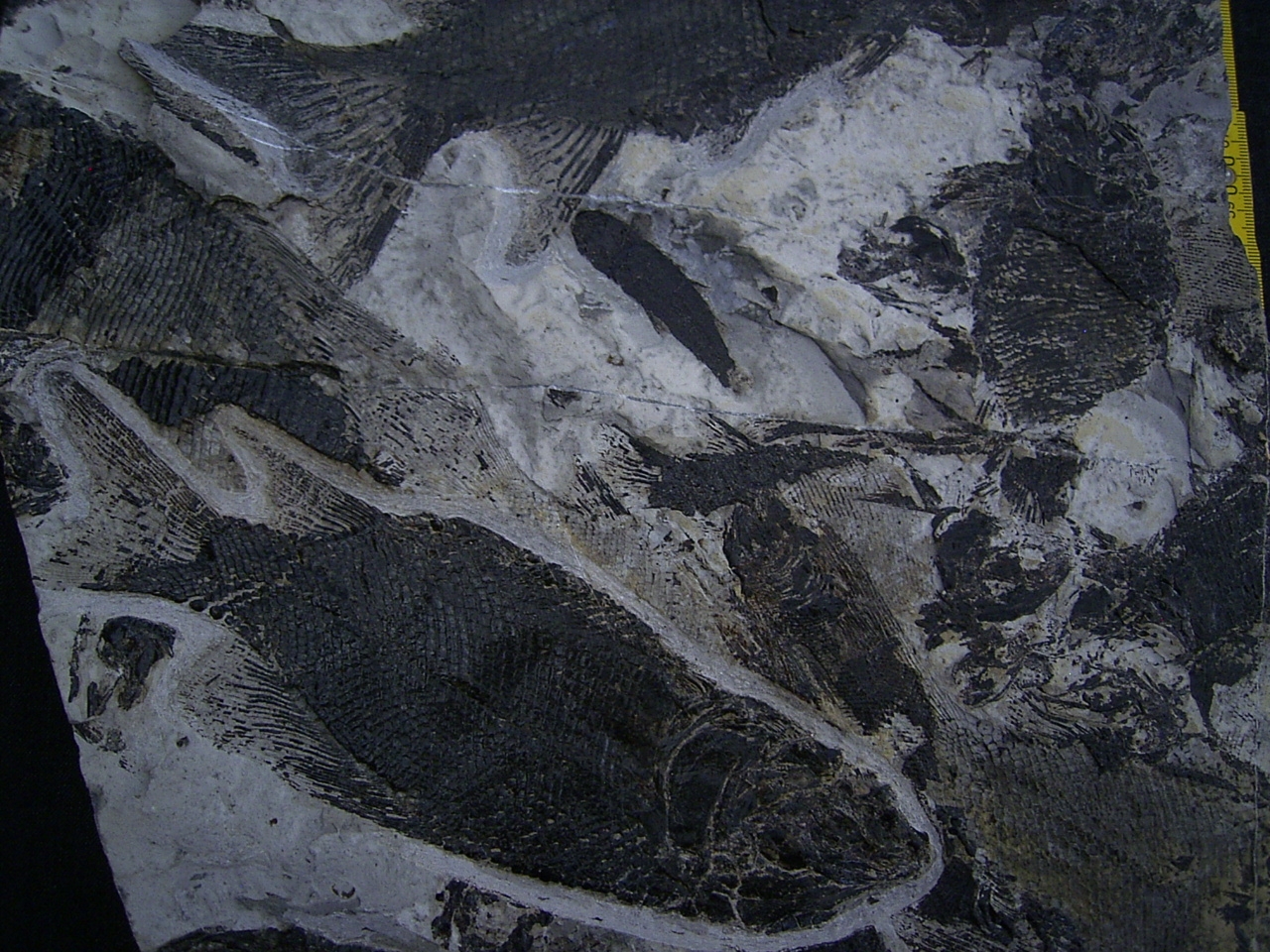 Diese große Platte mit vielen versteinerten Fischen stammt aus der oberen Trias (Noricum, etwa 220 Mio. Jahre alt) von Wiestal bei Hallein bei Salzburg in Österreich.