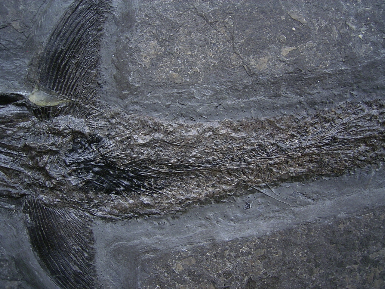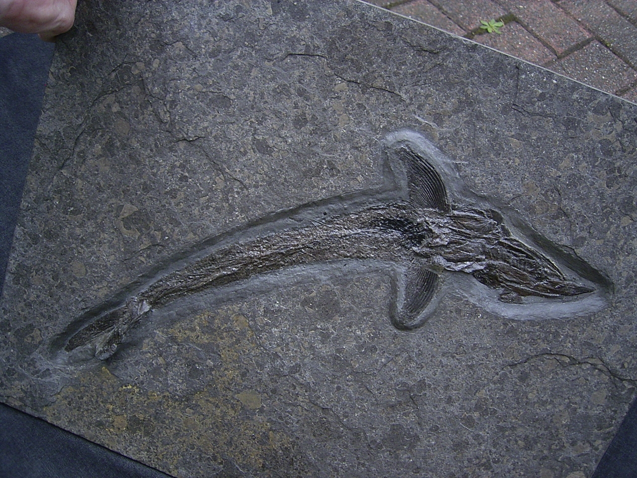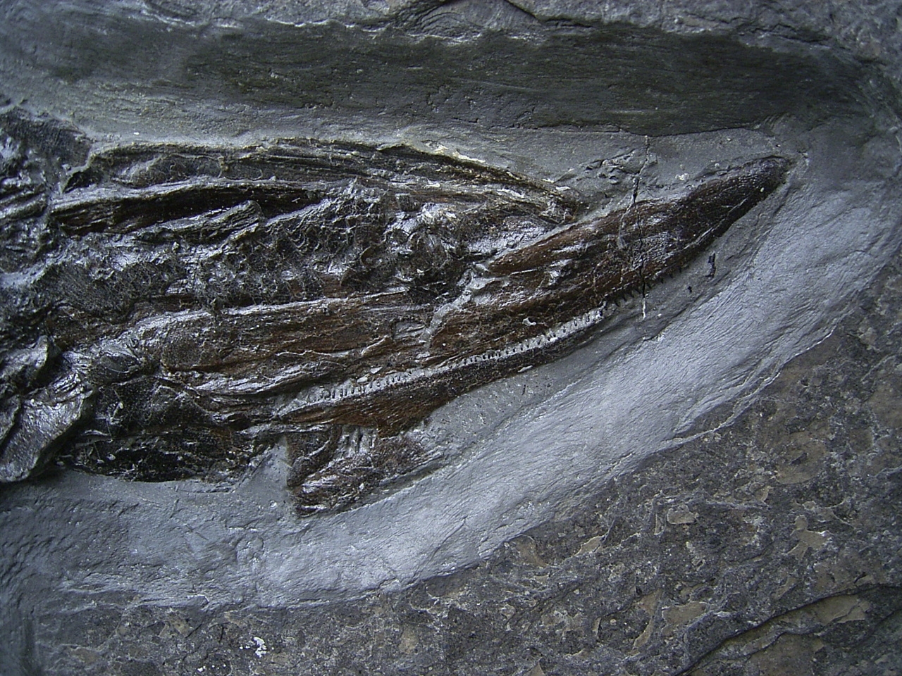 Dieser Pachycormus stammt aus dem Posidonienschofer (Lias epsilon) von Holzmaden. Diese Knochenfische sind heute ausgestorben.