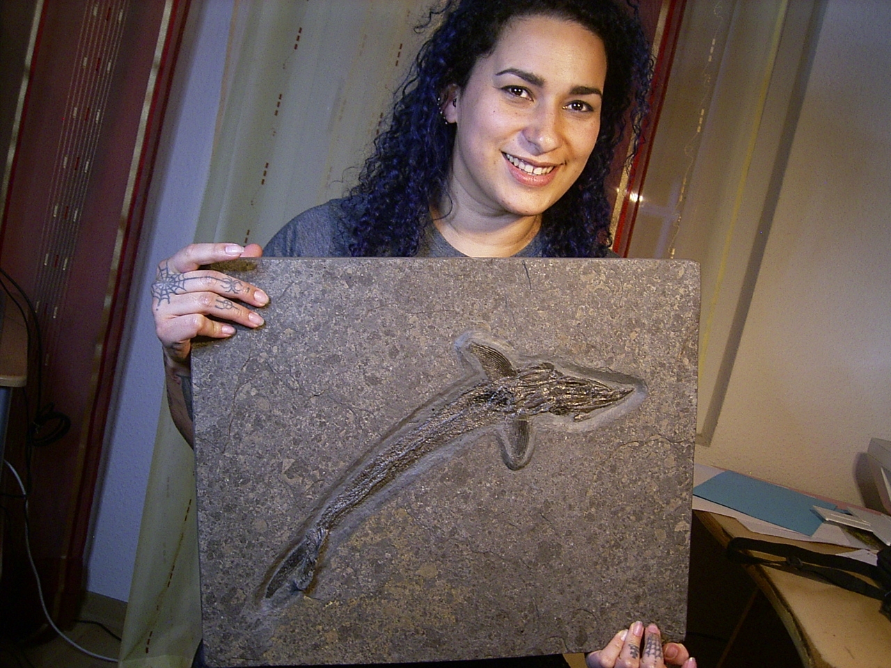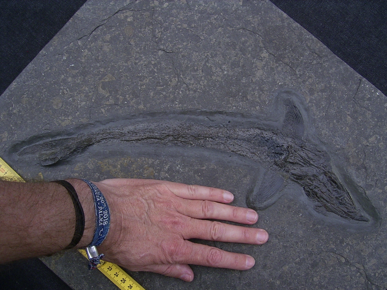 Der Fisch ist komplett erhalten, er misst etwa 42 cm (ausgestreckt etwas länger). Das Fossil wurde in eine Originalmatrix umgebettet und es eignet sich hervorragend als Wandschmuck. Die Platte ist ungebrochen, sie misst etwa 49 x 40 x 2,5 cm und wiegt ungefähr 8,5 Kilogramm.