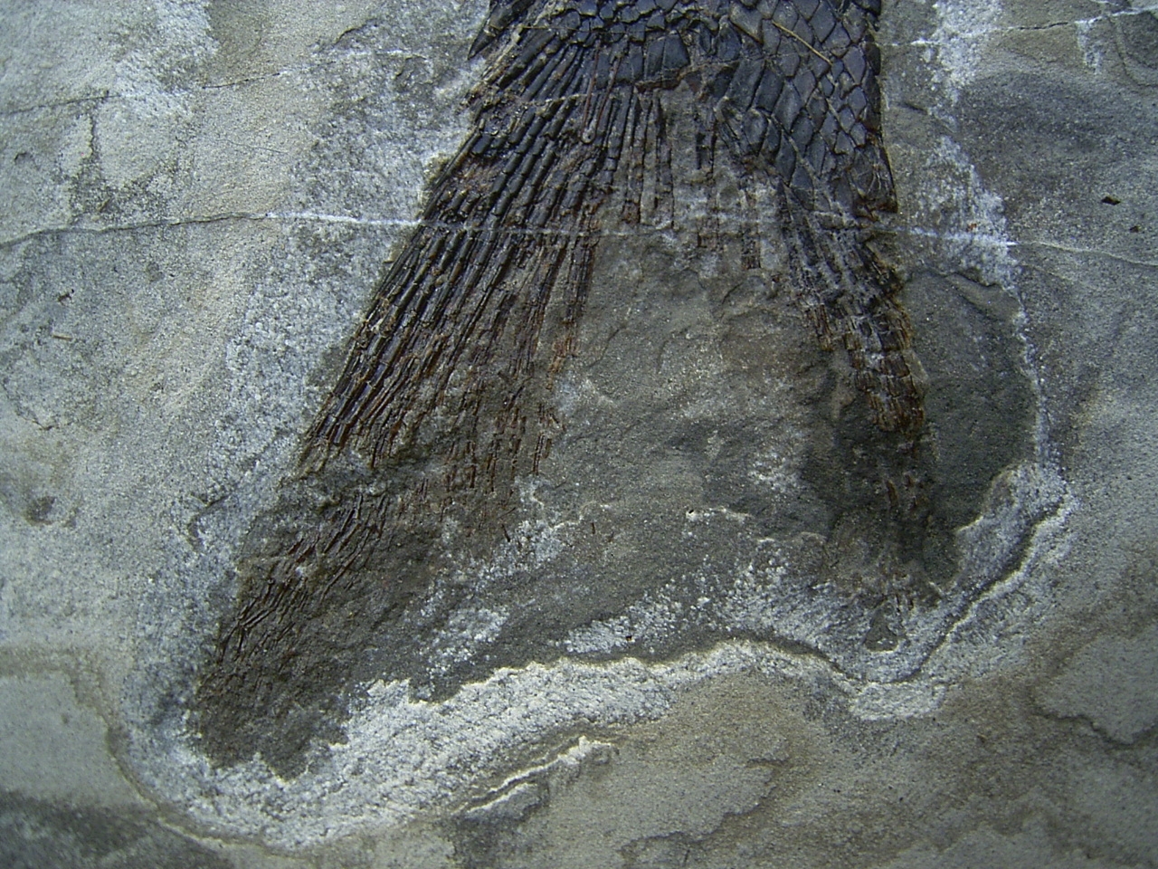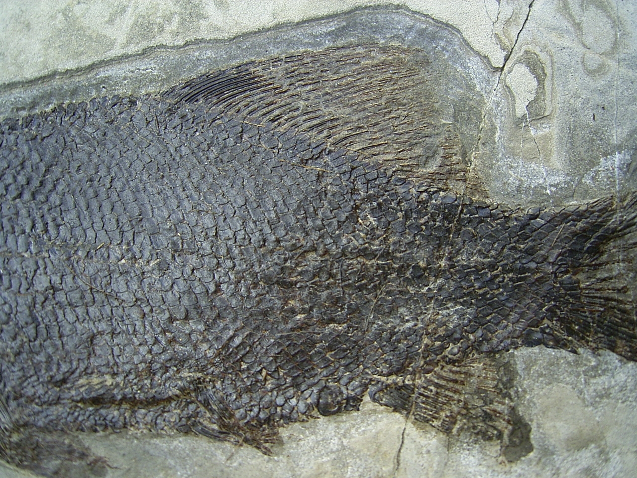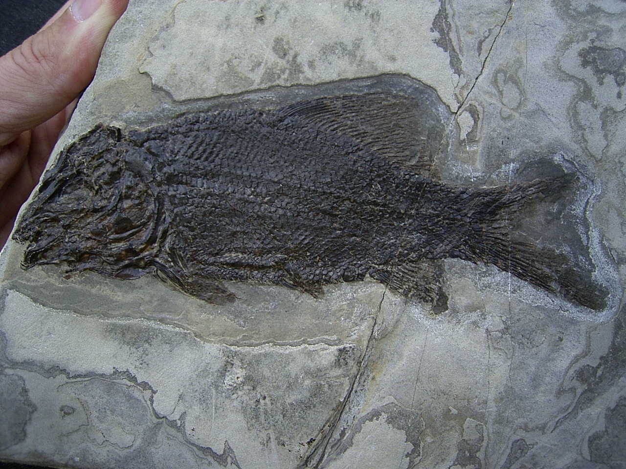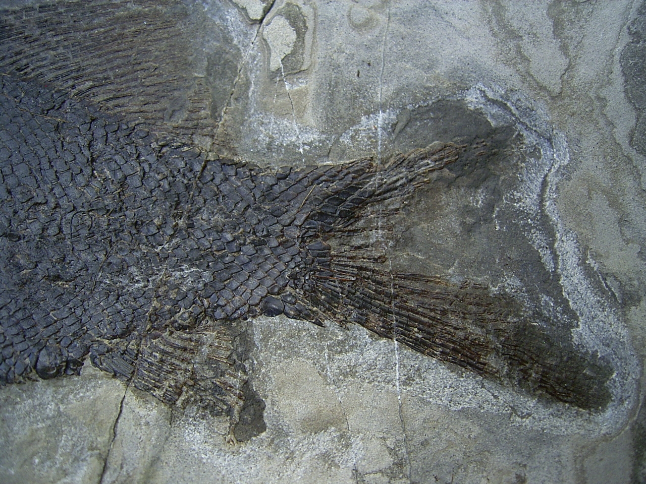 Dieser versteinerte Fisch stammt aus der oberen Trias (Noricum, etwa 220 Mio. Jahre alt) von Wiestal bei Hallein bei Salzburg in Österreich.