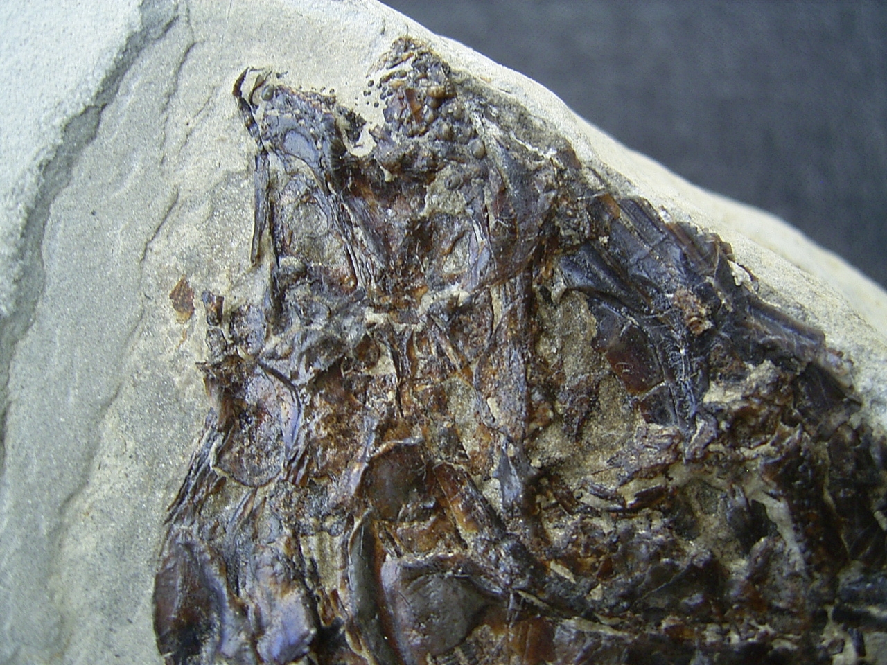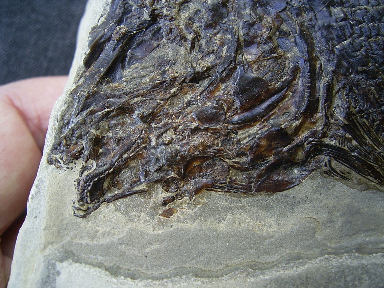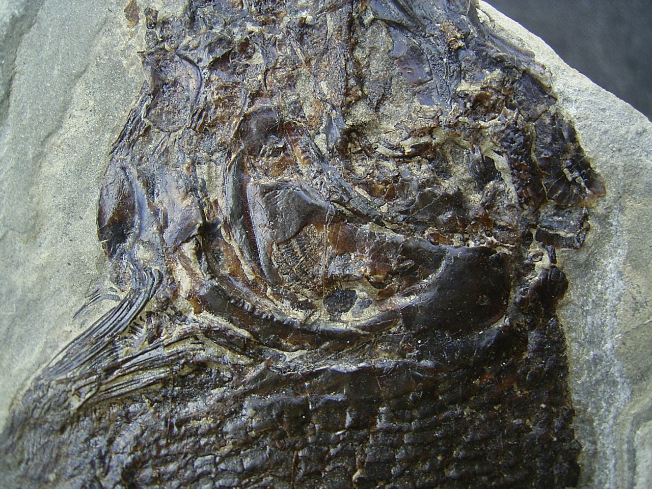Der Fisch ist bislang unbestimmt, es könnte sich um Colobodus oder Paralepidotus handeln. Gut zu erkennen sind die Pflasterzähne im Gebiss.