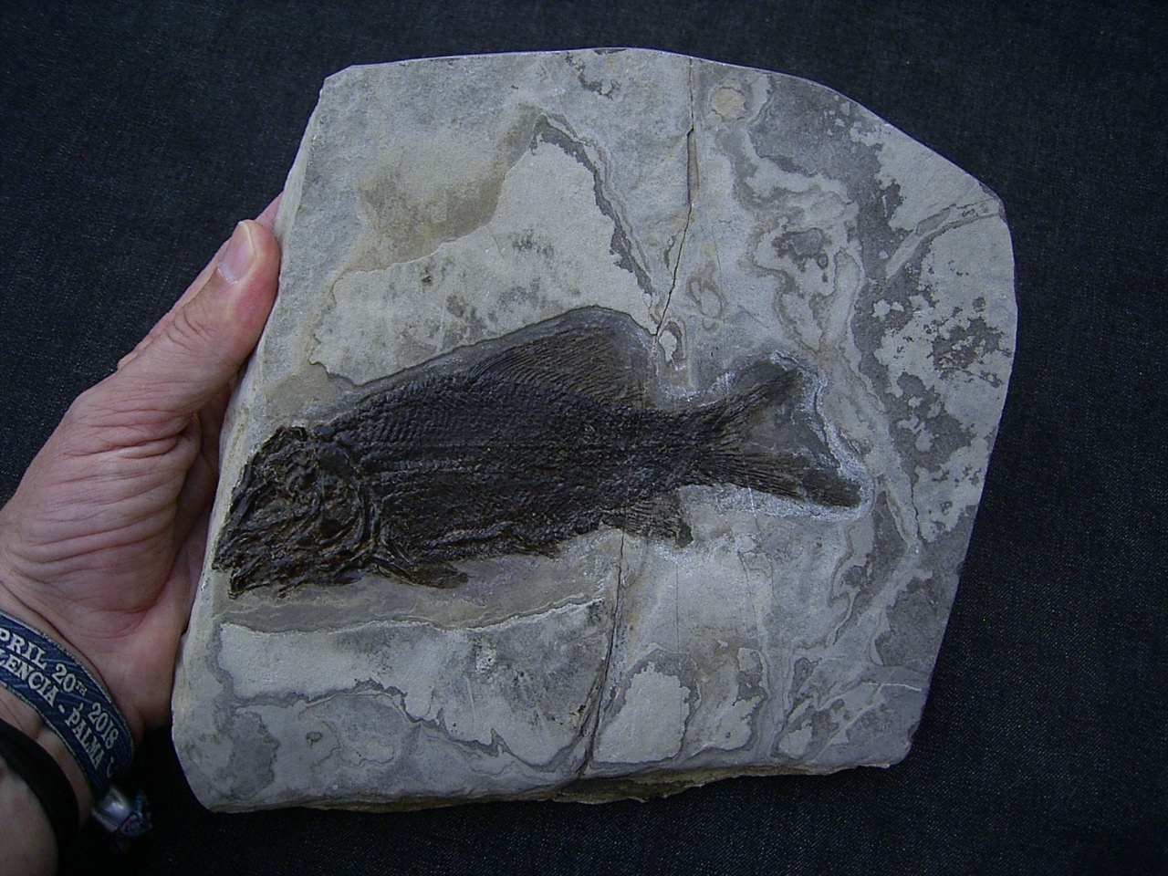 Der Fisch ist komplett erhalten, er misst etwa 17 cm. Der Stein war einmal gebrochen und wurde professionell verklebt. Er misst etwa 19 x 21 cm und hat eine Stärke von 3 cm.