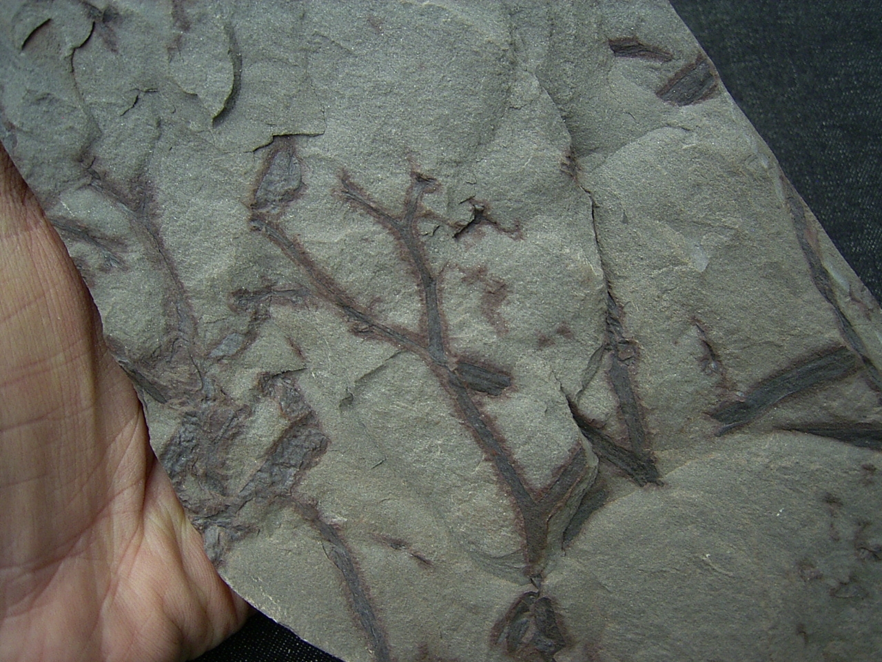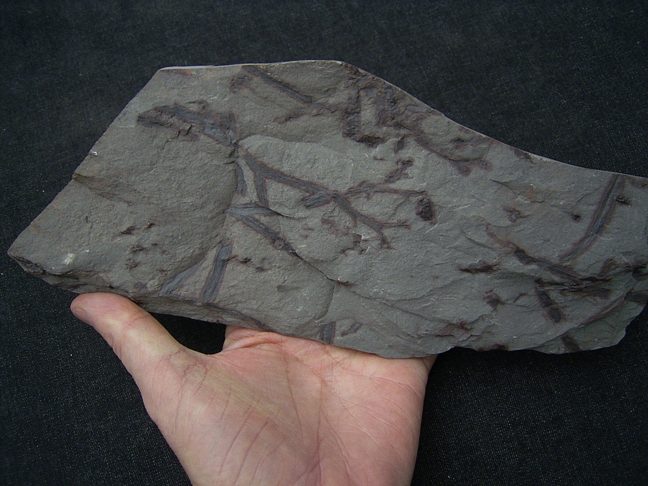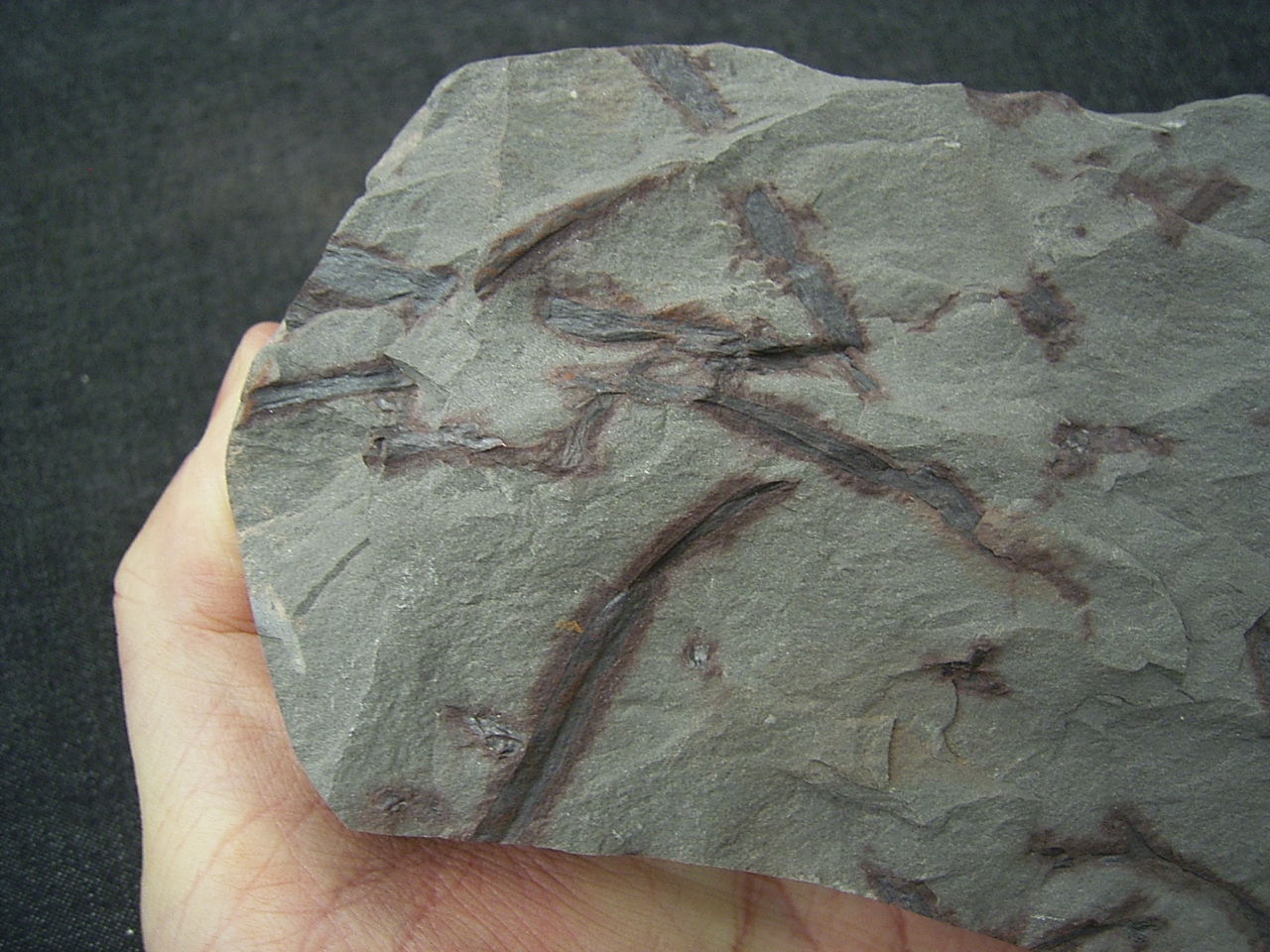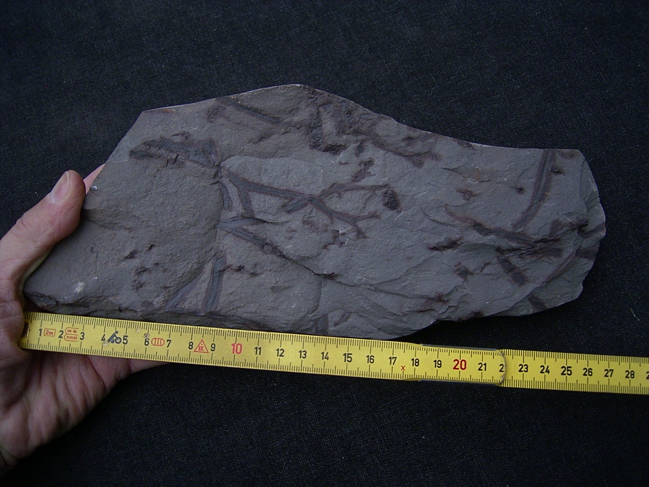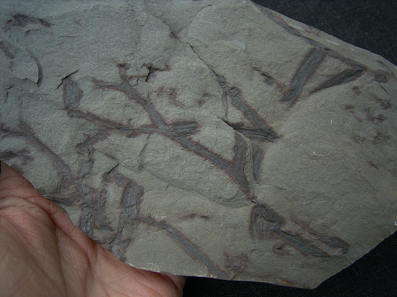 Diese Platte enthält interessante Pflanzenfossilien von Taeniocrada longisporangiata. Sie wurde gefunden in den Sedimenten des Unter-Devon (Klerfer Schichten) der Olkenbacher Mulde in der Eifel.