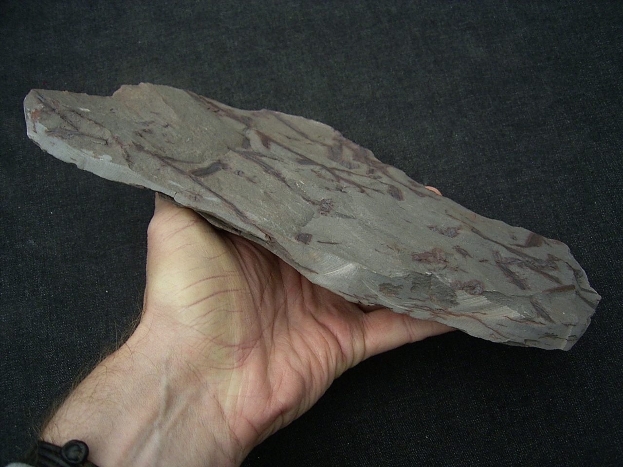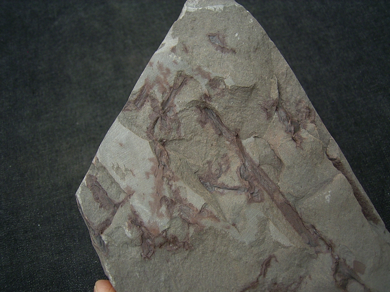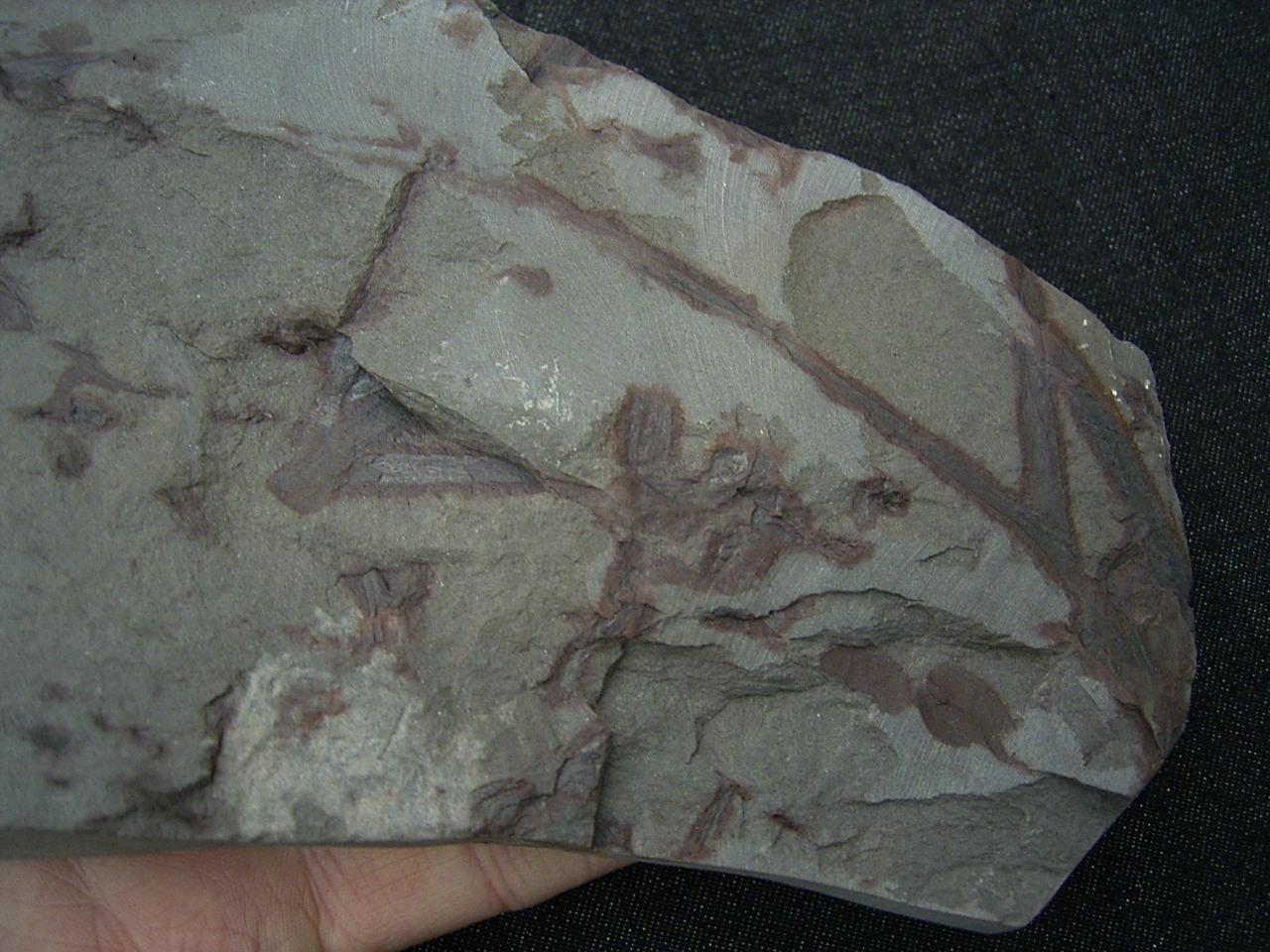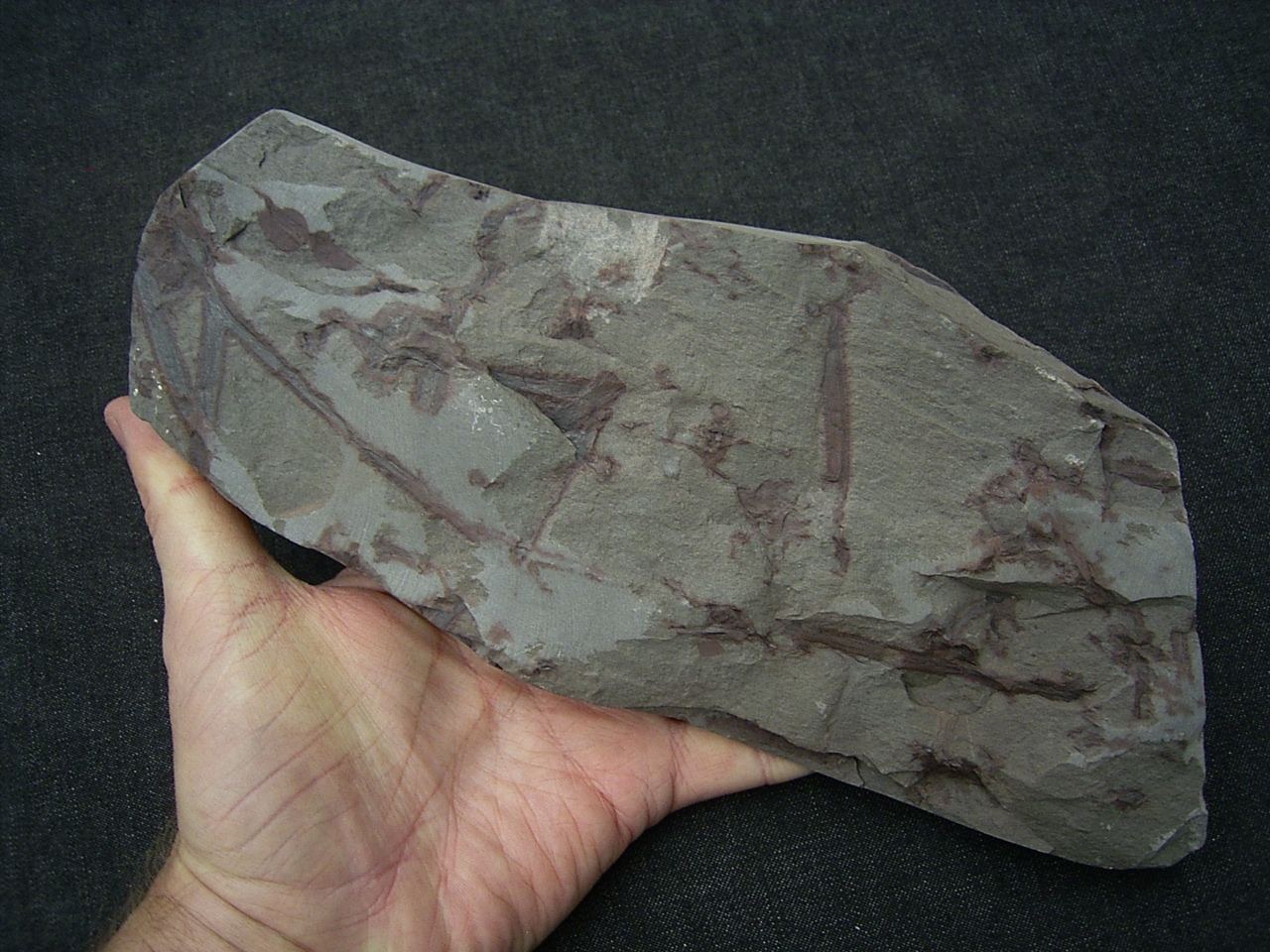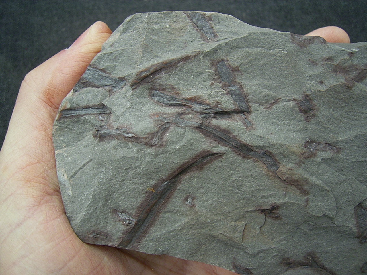 Diese Platte enthält interessante Pflanzenfossilien von Taeniocrada longisporangiata. Sie wurde gefunden in den Sedimenten des Unter-Devon (Klerfer Schichten) der Olkenbacher Mulde in der Eifel.