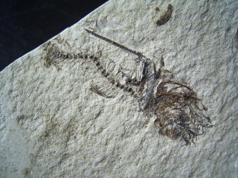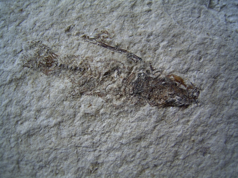 Auf der Rückseite des Steines befindet sich ein weiterer (noch unpräparierter) Fisch. Eine Ecke der Matrix ist gebrochen. Es wurde noch nicht verklebt, da an den Bruchflächen drei weitere Fossilien zu erkennen sind. Hier könnte noch einiges freigelegt werden. Es hat den Anschein als sei die gesamte Platte mit Fossilien durchzogen. Aus diesem Sediment sind auch fantastisch erhaltene Insekten und Pflanzen bekannt.