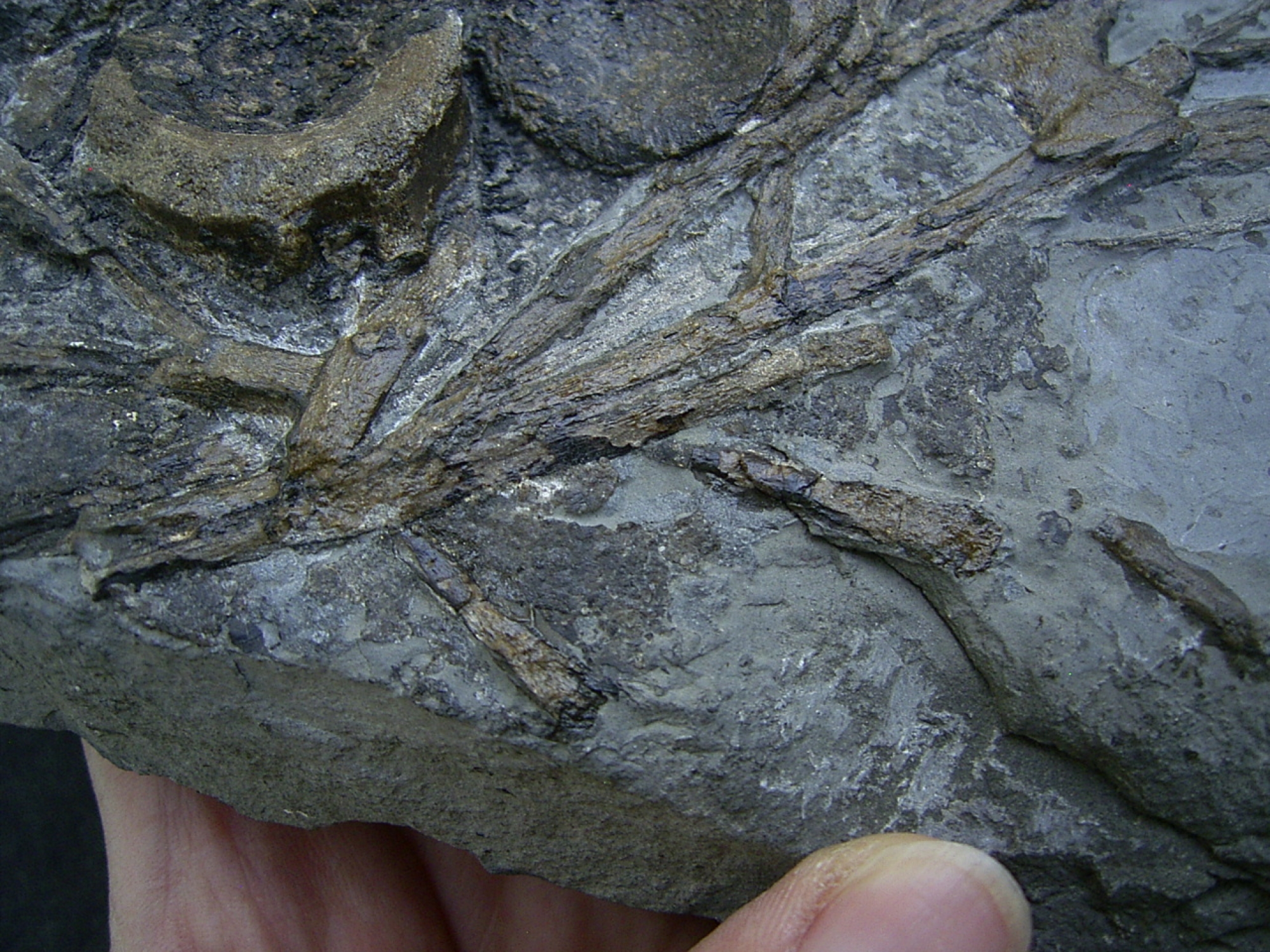 Der Stein enthält eine Vielzahl von Knochen wie Wirbel und Rippen. Interessant: Aufgrund der schonenden Praeparation mittels Sandstrahltechnik konnten Reste des Mageninhaltes (schwarze Bereiche) erhalten werden.