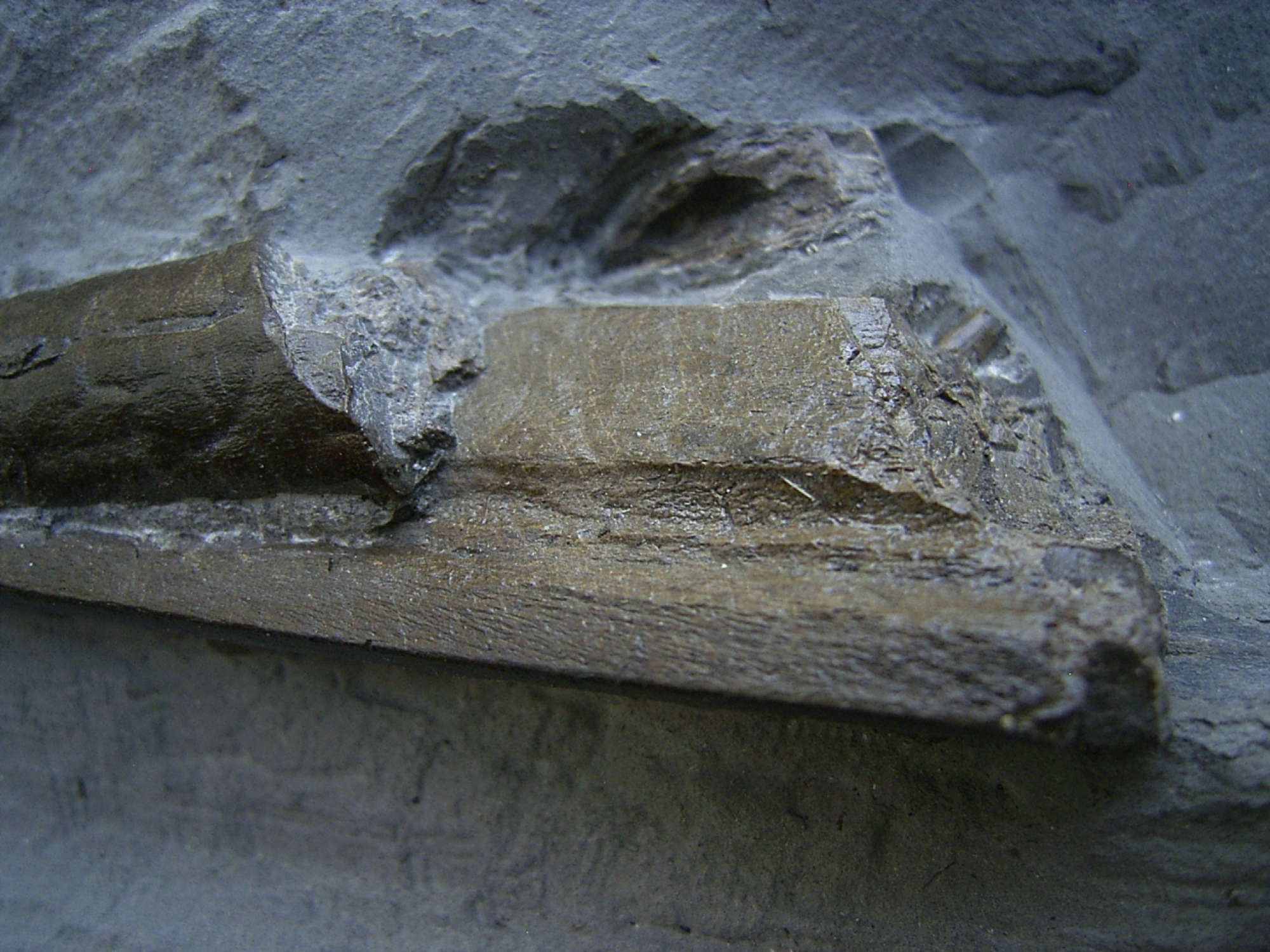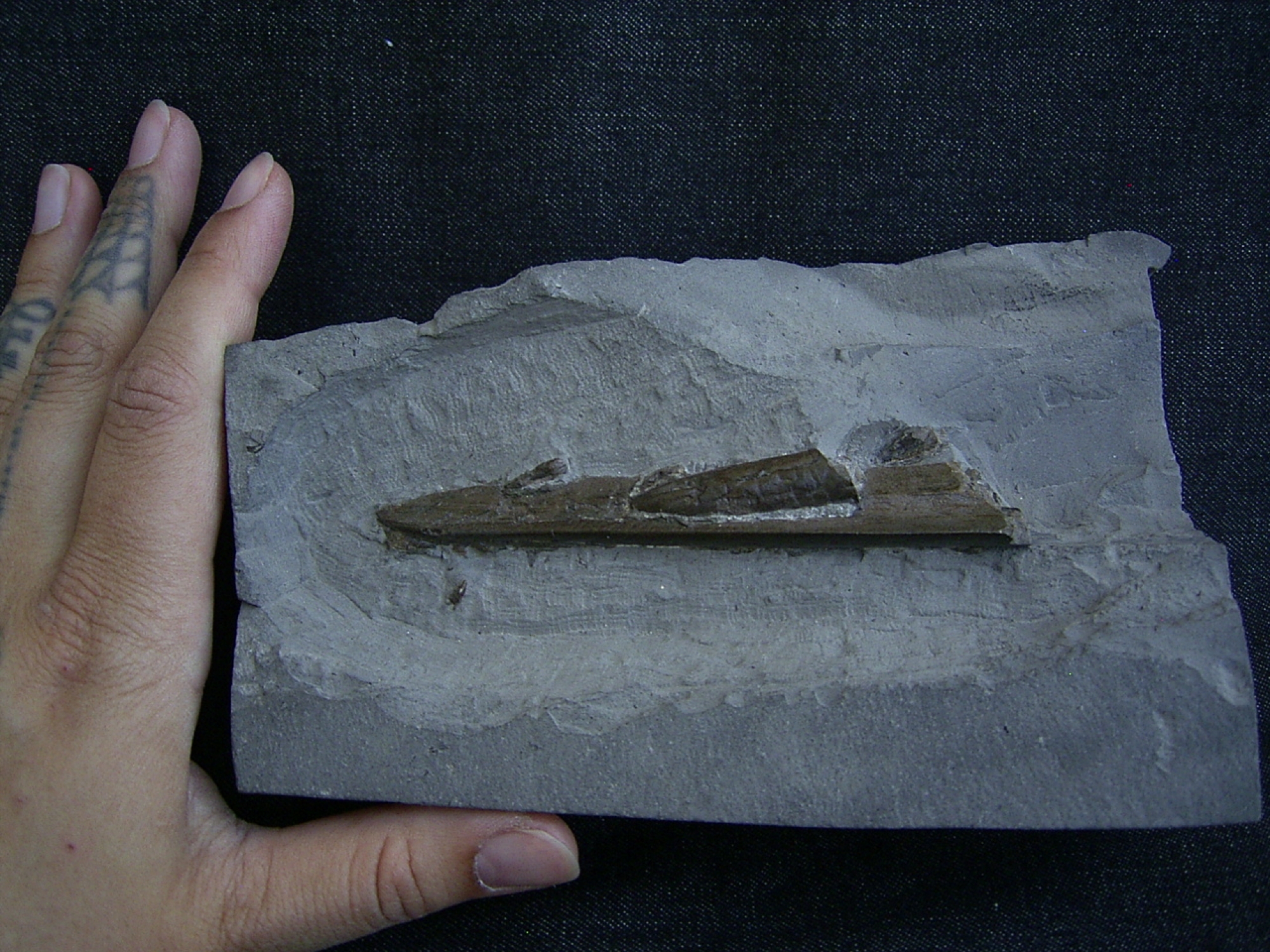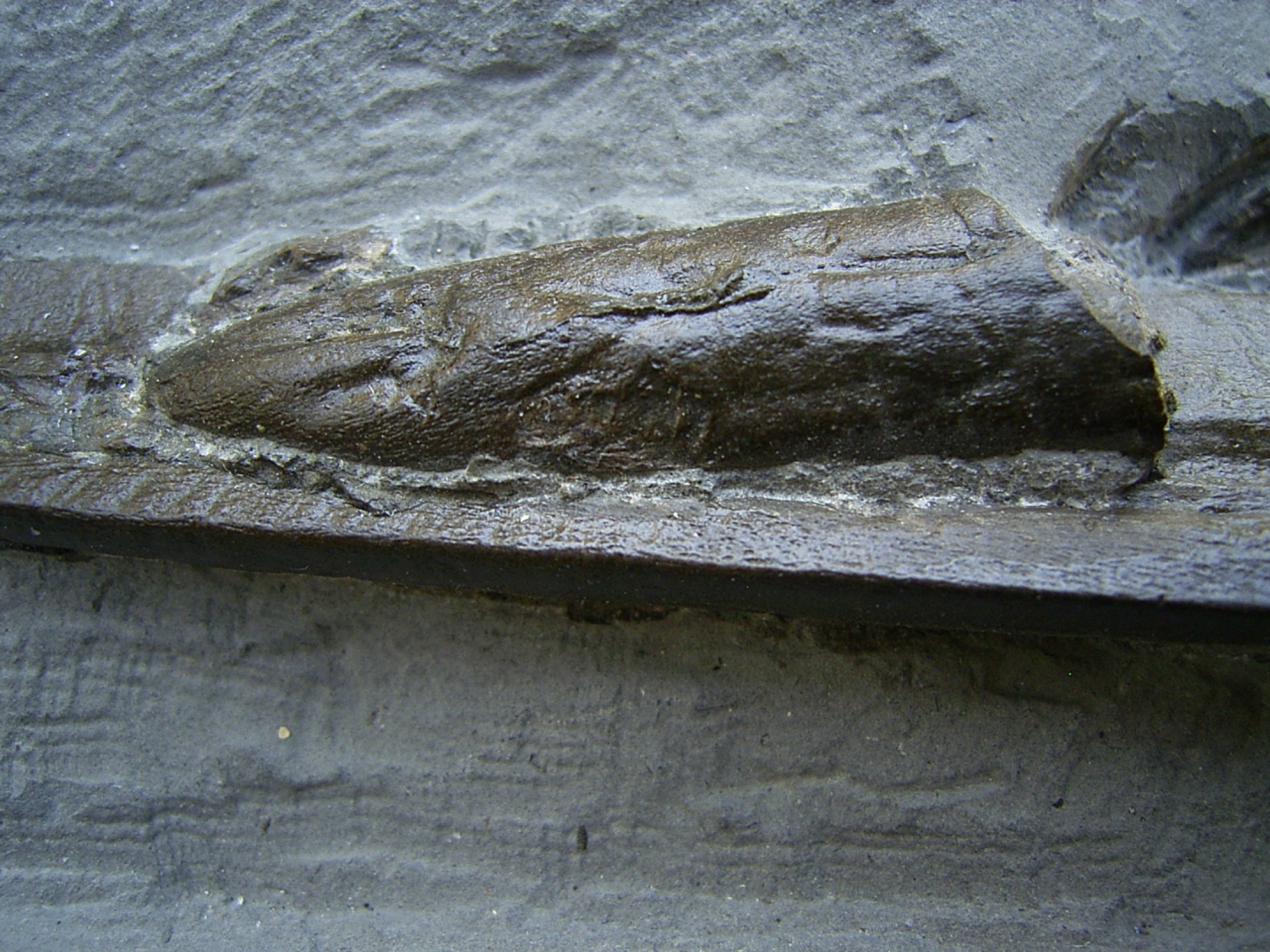Hier handelt es sich um die Schnauzenspitze mit ein paar Zähnen vom Ichthyosaurus Stenopterygius spec.