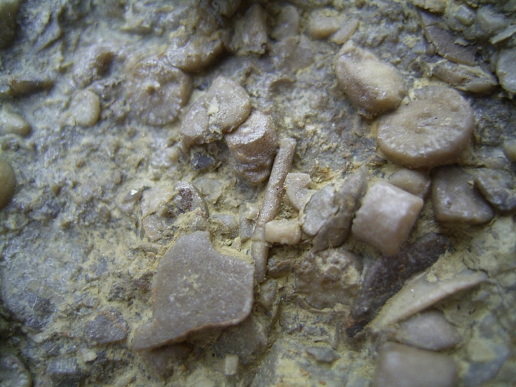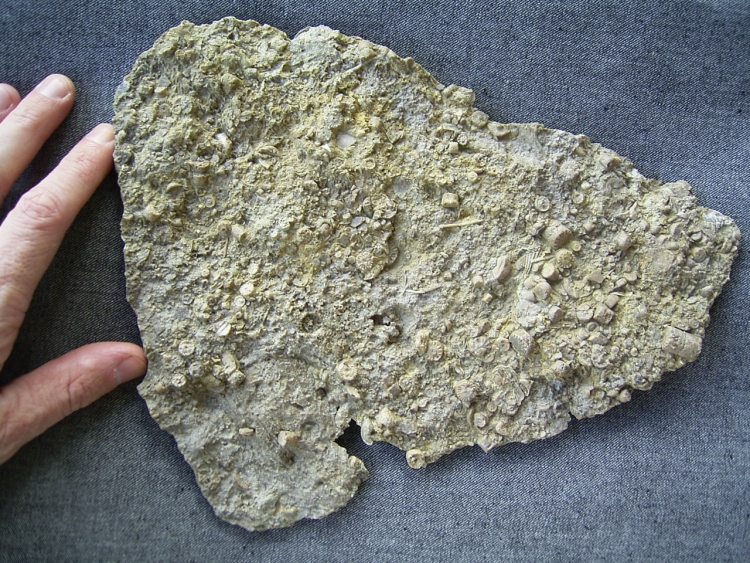 Diese Platte stammt aus dem Muschelkalk von Crailsheim. Neben einer Vielzahl von Seelilienstielgliedern (auf Vorder- und Rückseite) enthält der Stein einige Reste von Seeigeln (Stacheln und Kieferteile).