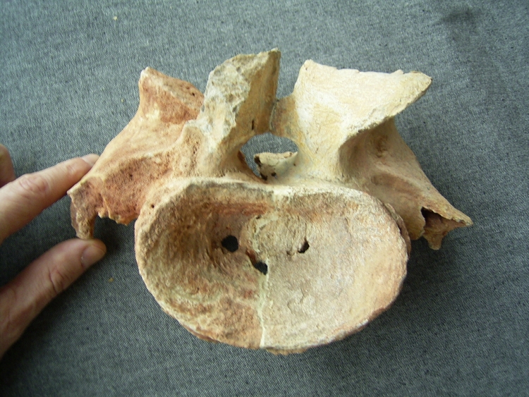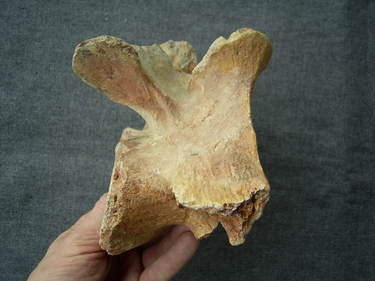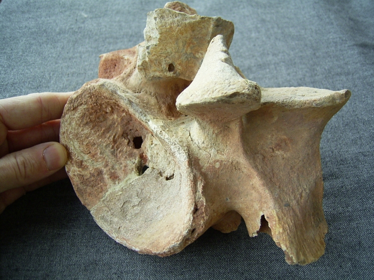 Dieser große Hals-Wirbel eines Spinosaurus stammt aus der Kreide von Taouz, Marokko.