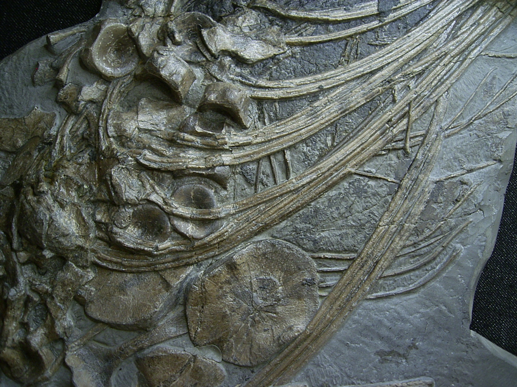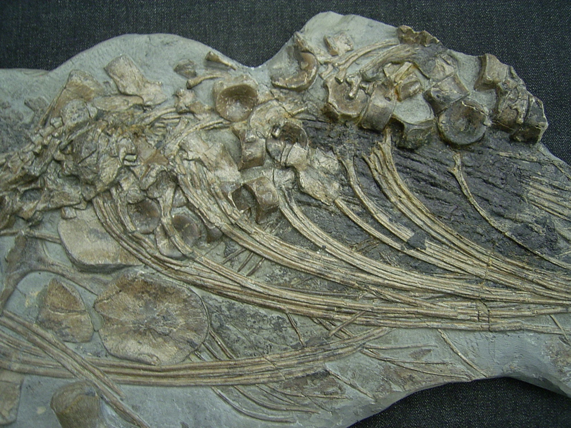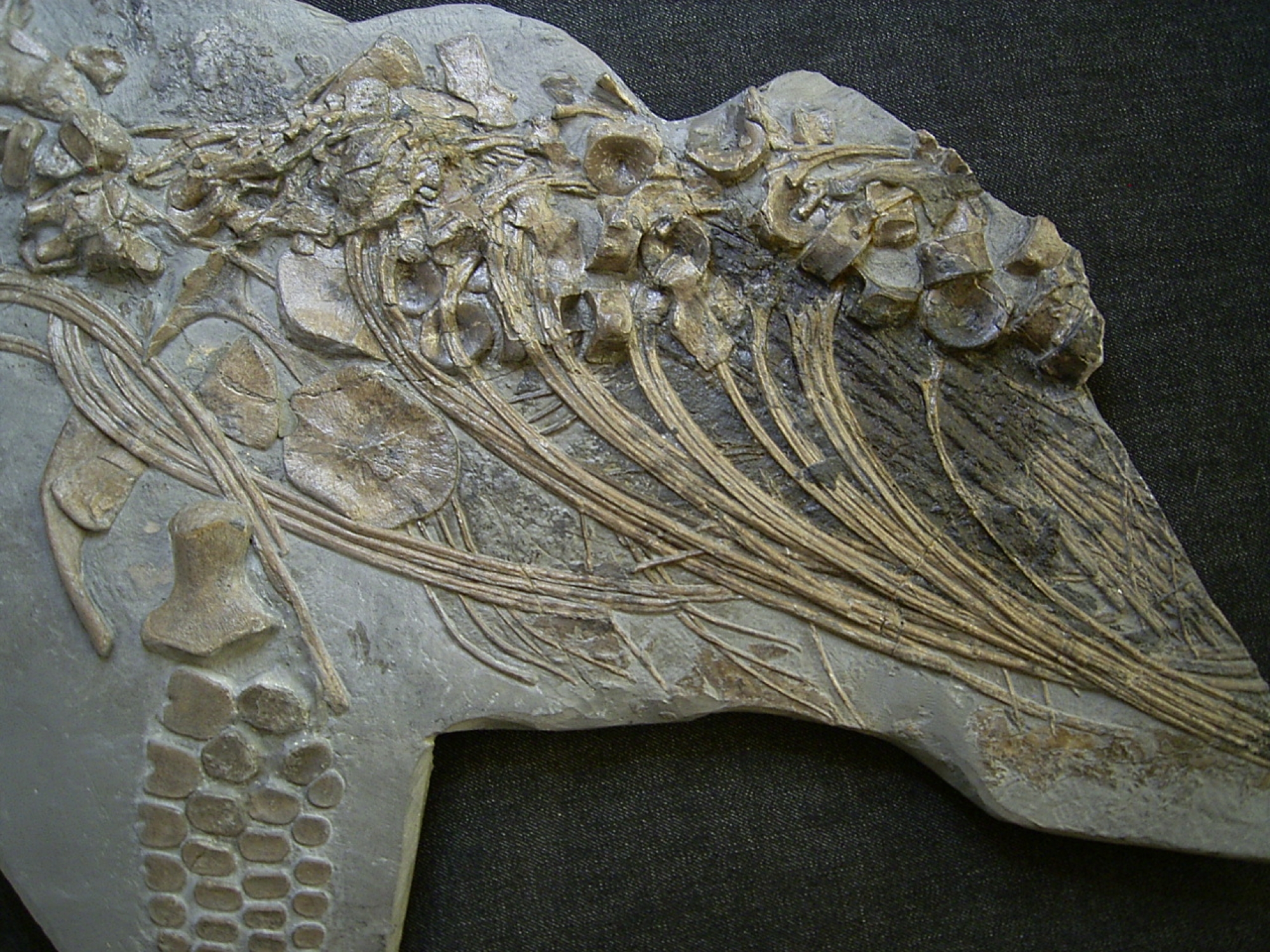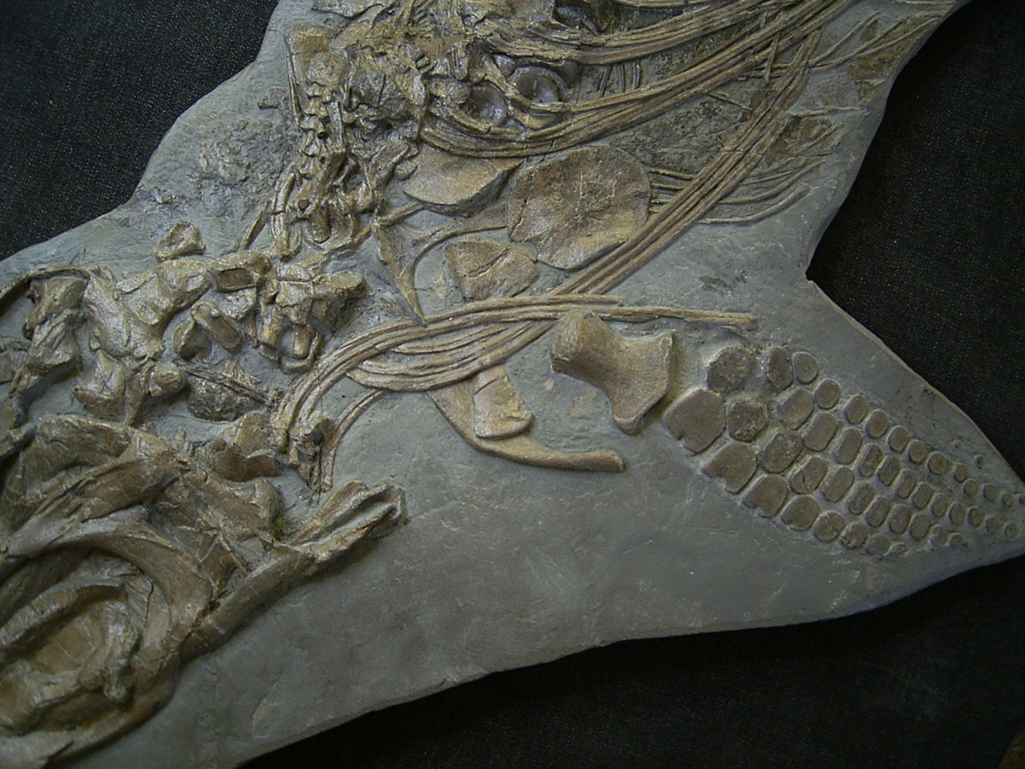 Der Saurier ist hervorragend erhalten und perfekt präpariert. Sogar die letzte Malzeit des Tieres ist als Mageninhalt überliefert und unterhalb des Bauches und am Hals erkennt man sogar noch Reste der Haut bzw. Muskelfasern.