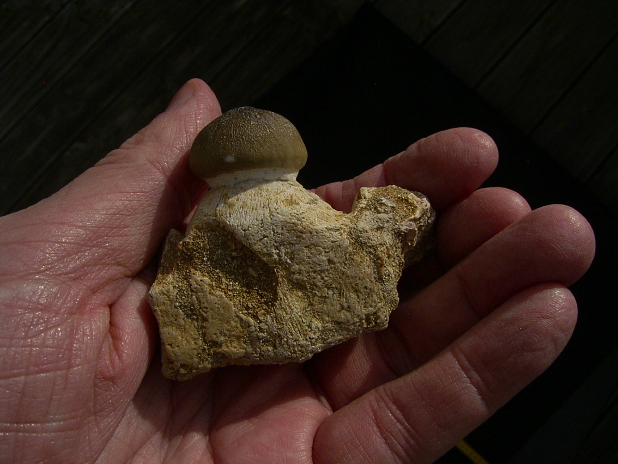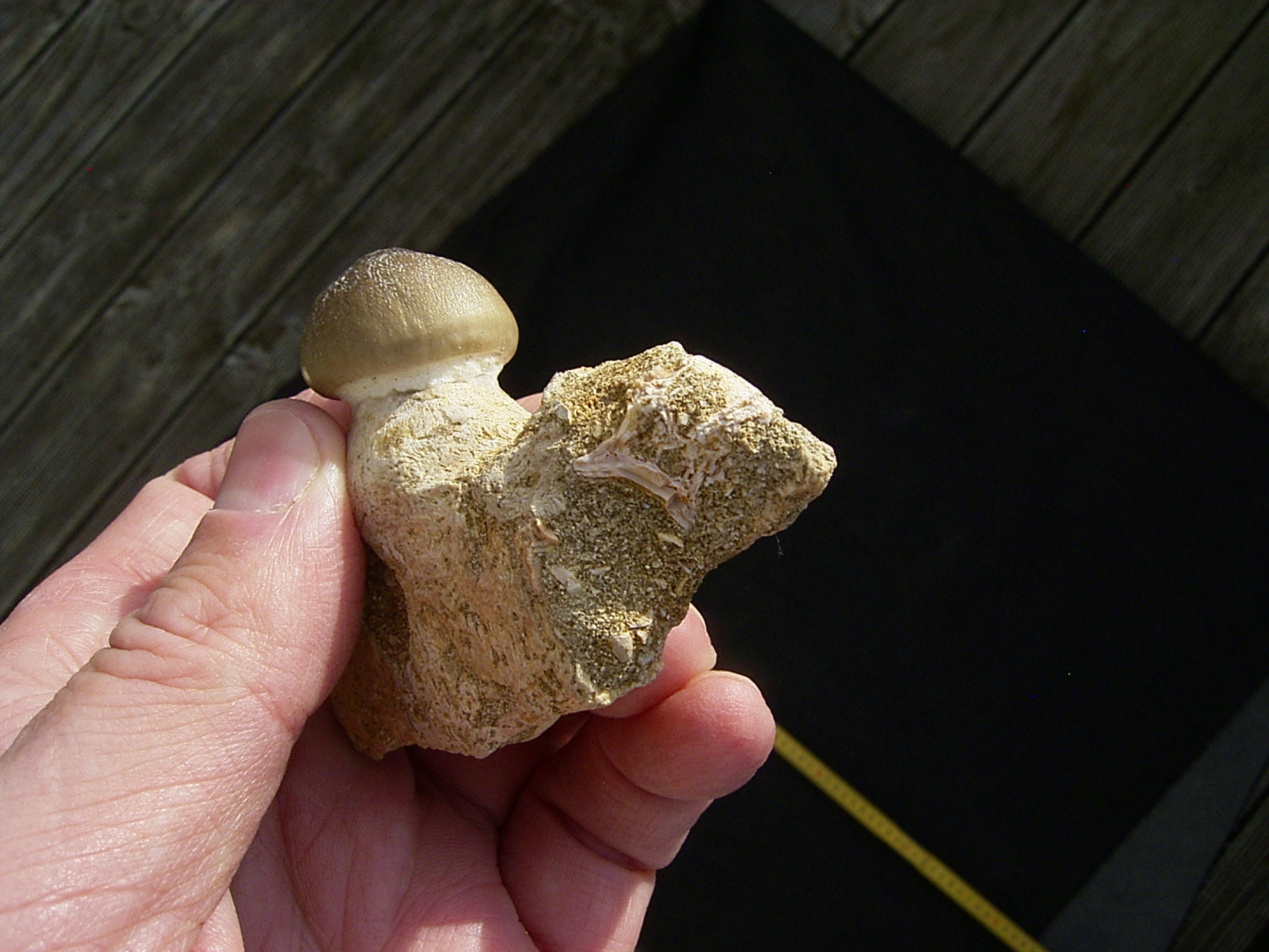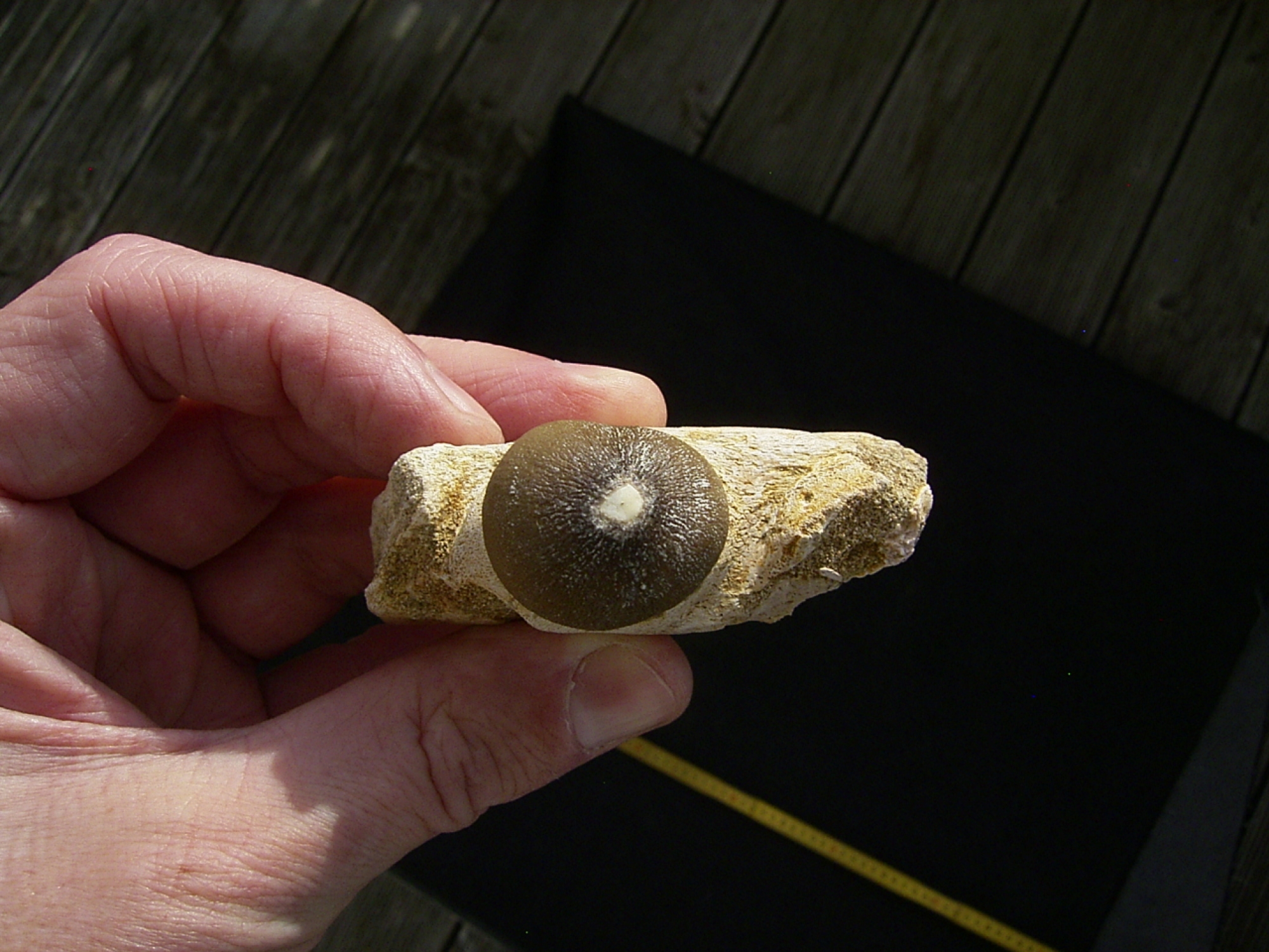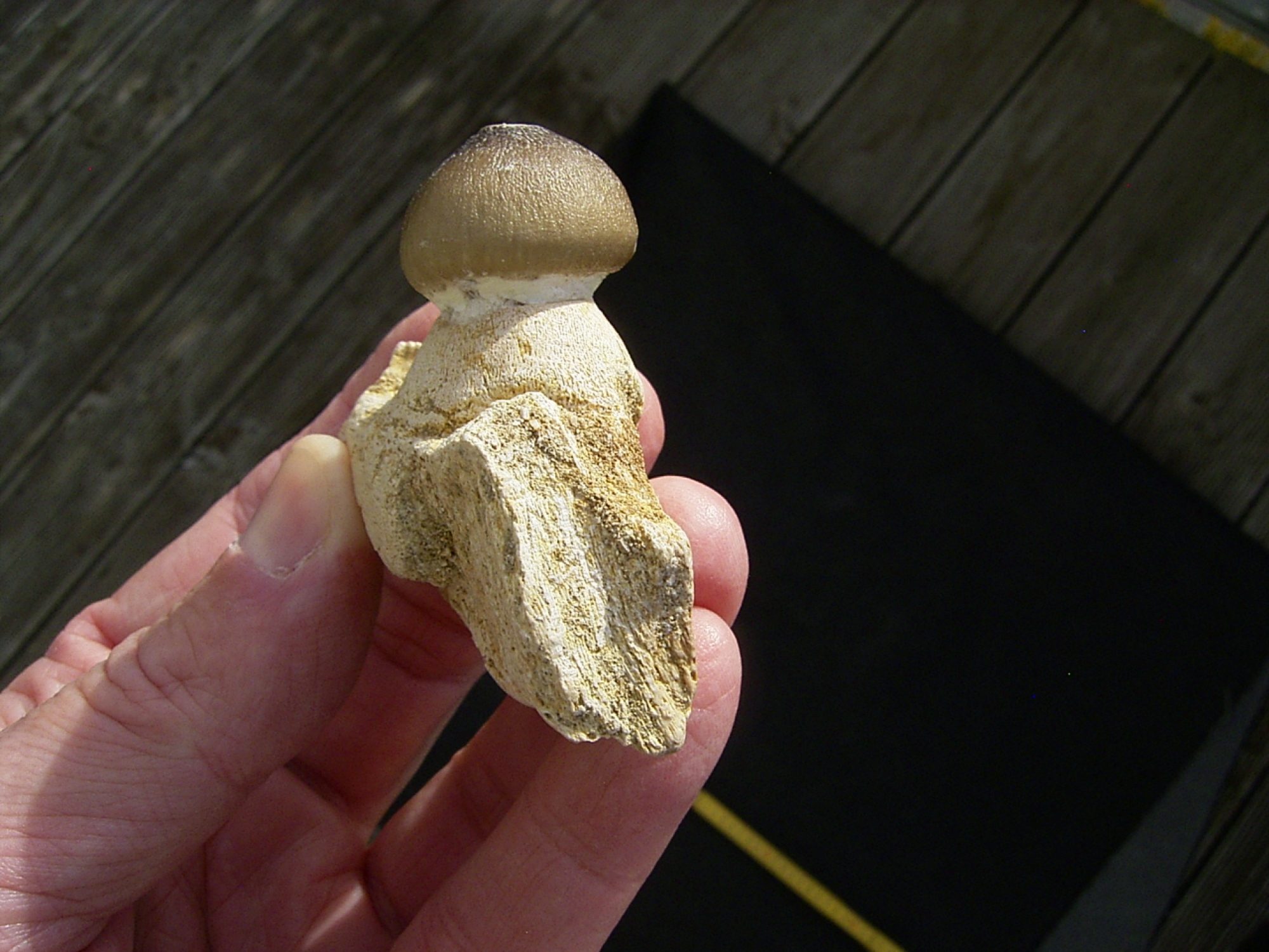 Hier handelt es sich um ein Kieferstück mit einem Zahn des Mosasauriers Globidens. Das Fossil stammt aus den Phosphatminen von Kouribga in Marokko. Die Sedimente dort stammen aus der Kreidezeit und sind etwa 65 Millionen Jahre alt.