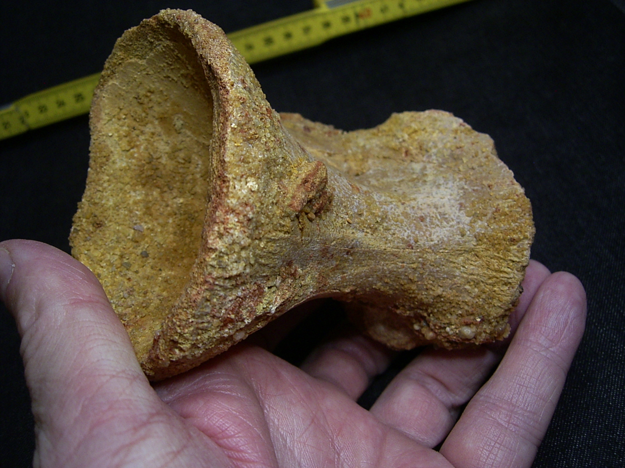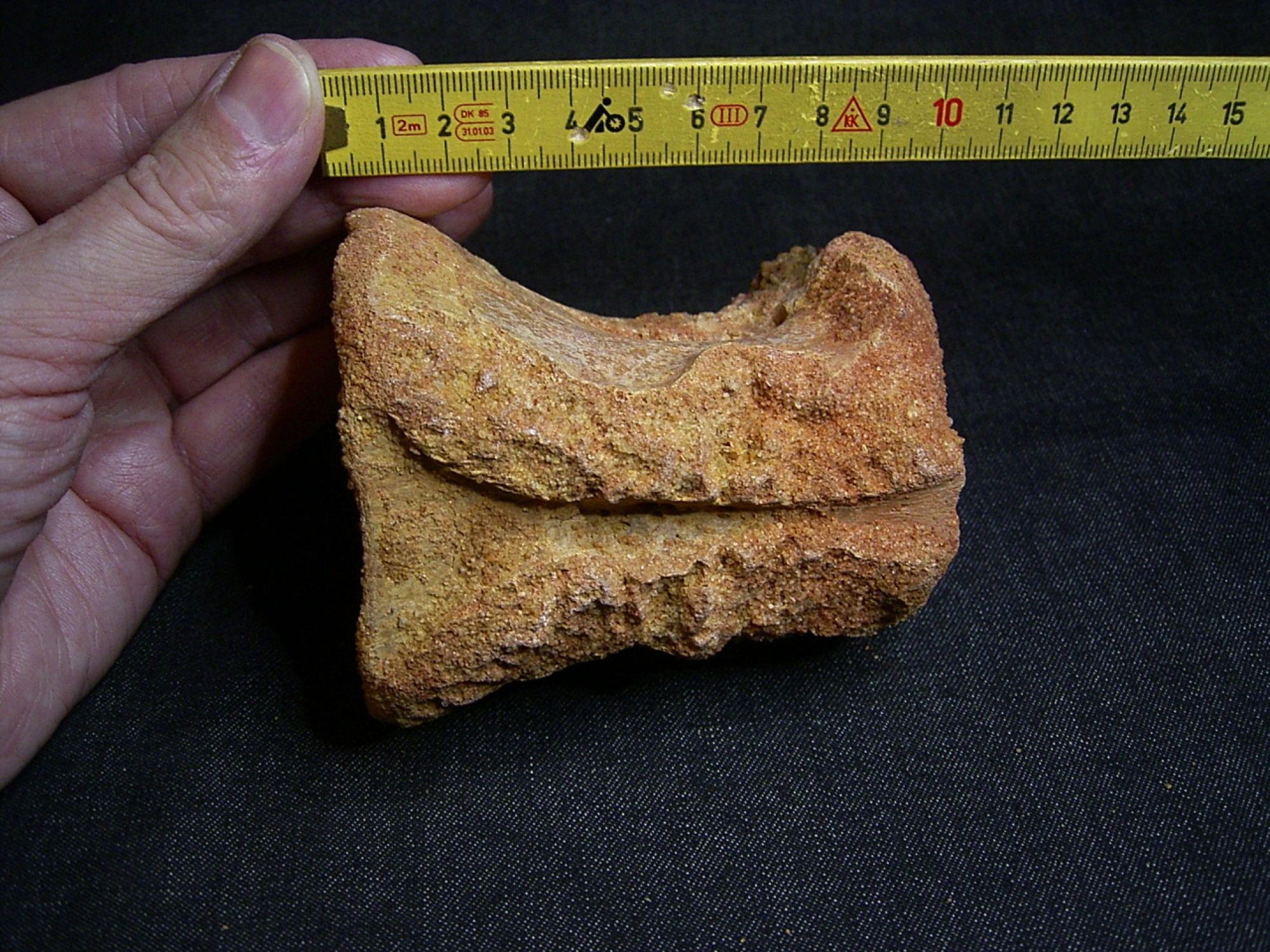 This vertebra of the carnivore Spinosaurus comes from the Cretaceous of Taouz in Morocco.