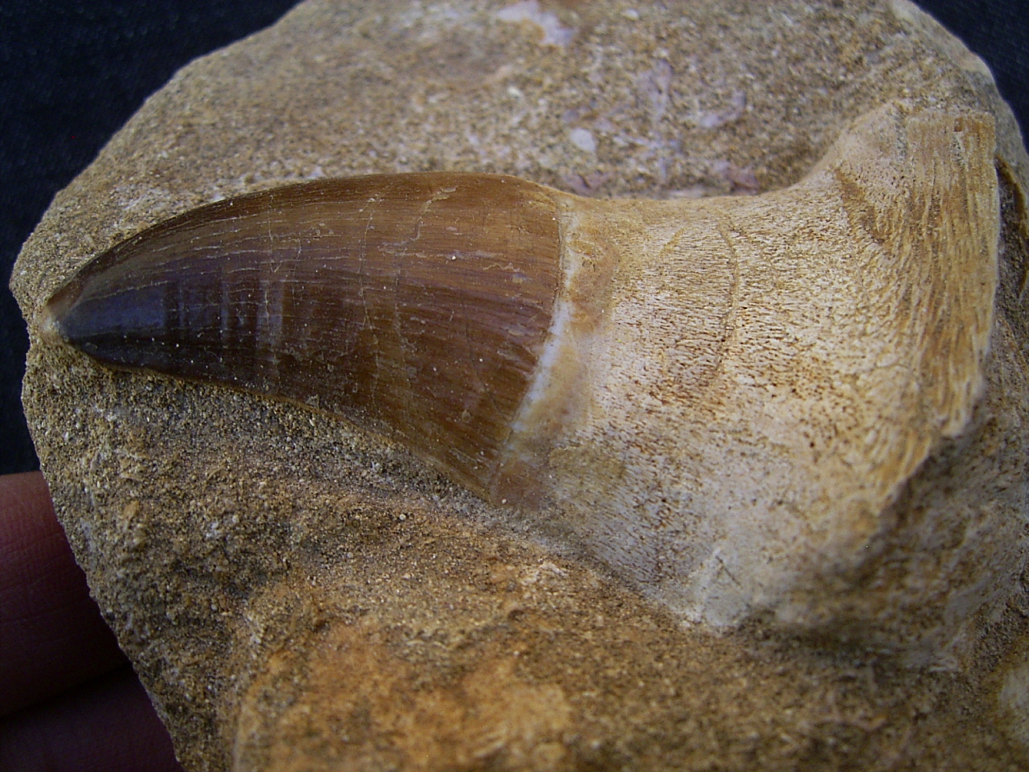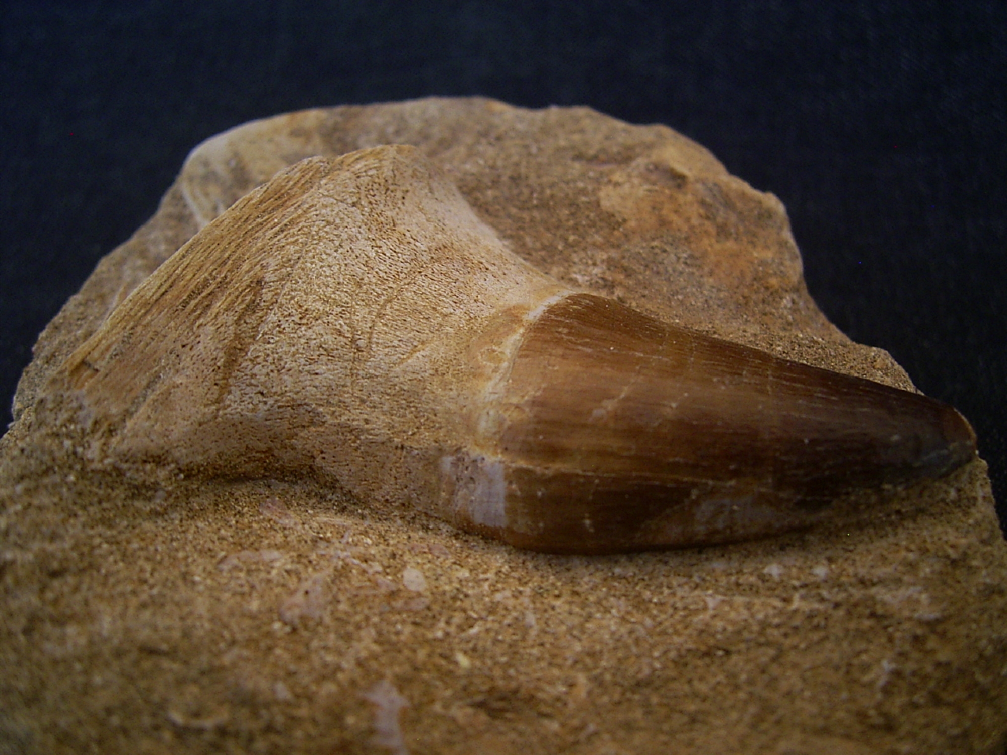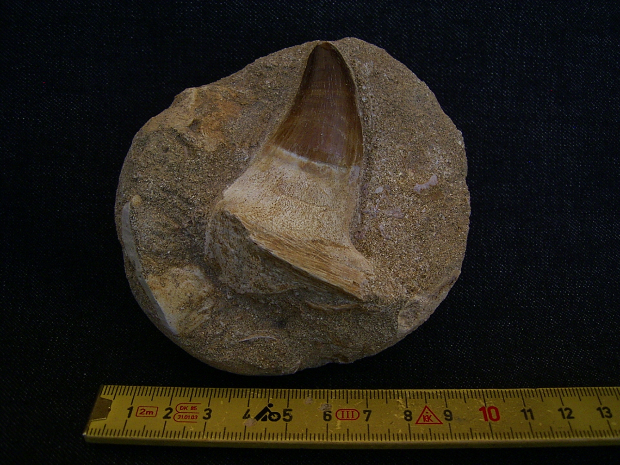 Der Zahn ist komplett mit Wurzel überliefert und steckt noch im Kieferknochen. Die Groesse des Fossils betraegt etwa 7 cm. Interessant sind die abgekaute (nicht abgebrochene!) Spitze und Seitenfläche.