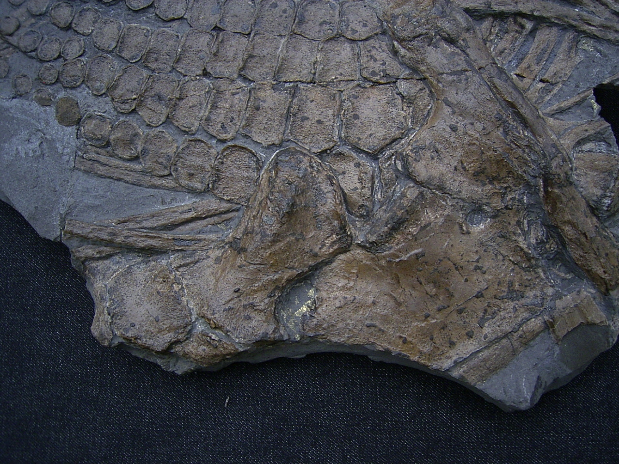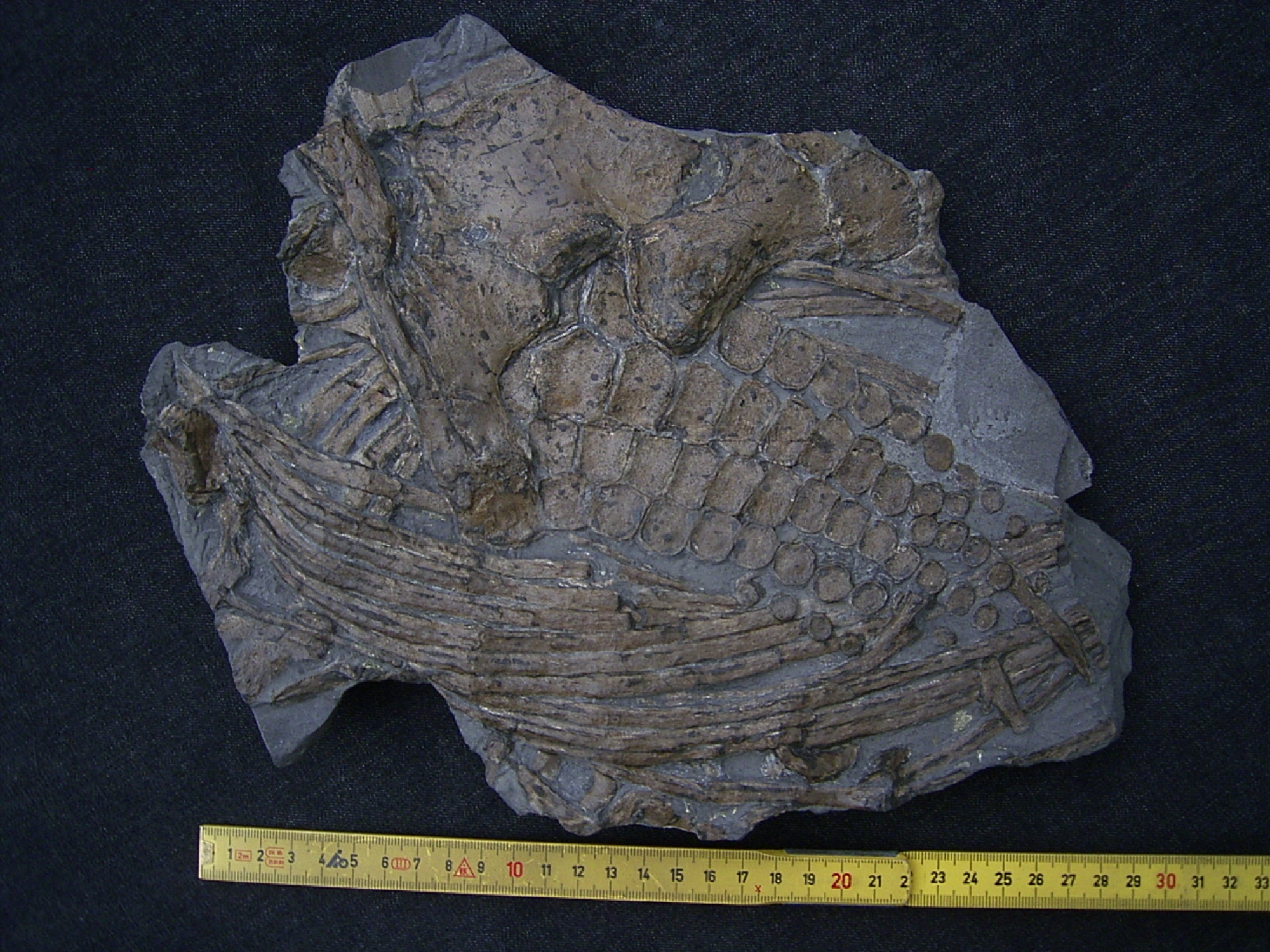 Diese Platte mit Knochen von Ichthyosaurus stammt aus dem Unterjura (Lias epsilon - Posidonienschiefer) von Holzmaden.