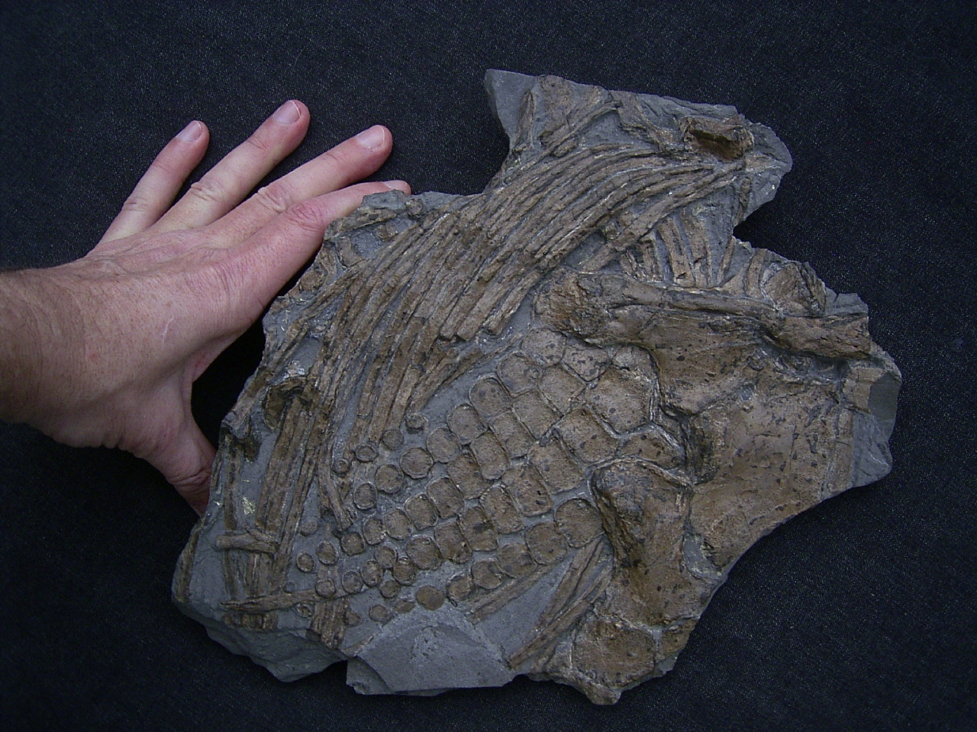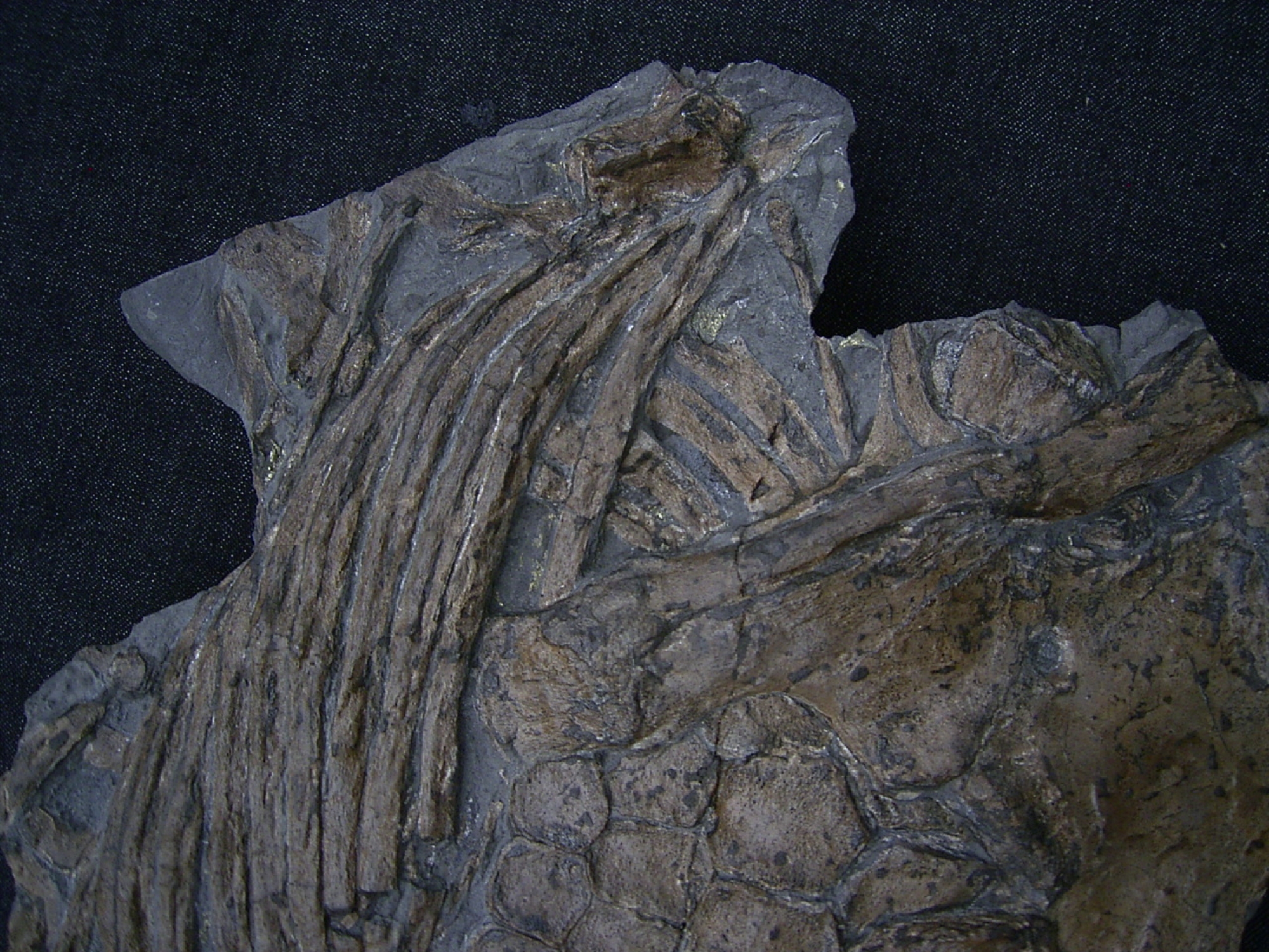 Der Stein enthält ein komplettes und schön artikuliertes Vorderpaddel, den Schulterbereich mit Humerus, diverse Wirbel und Rippen.