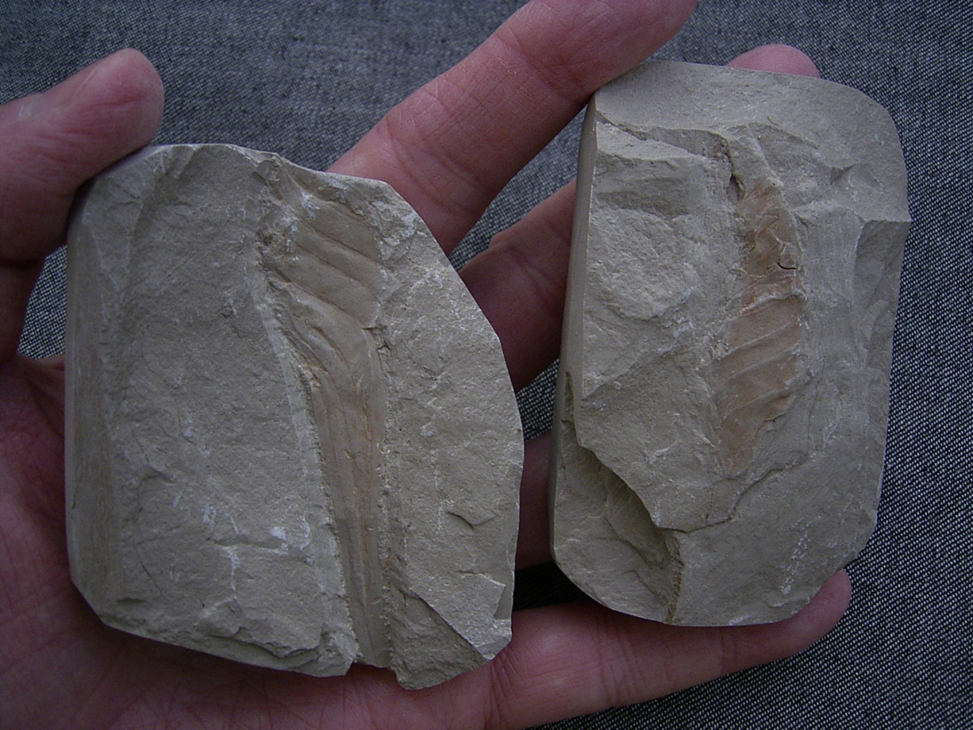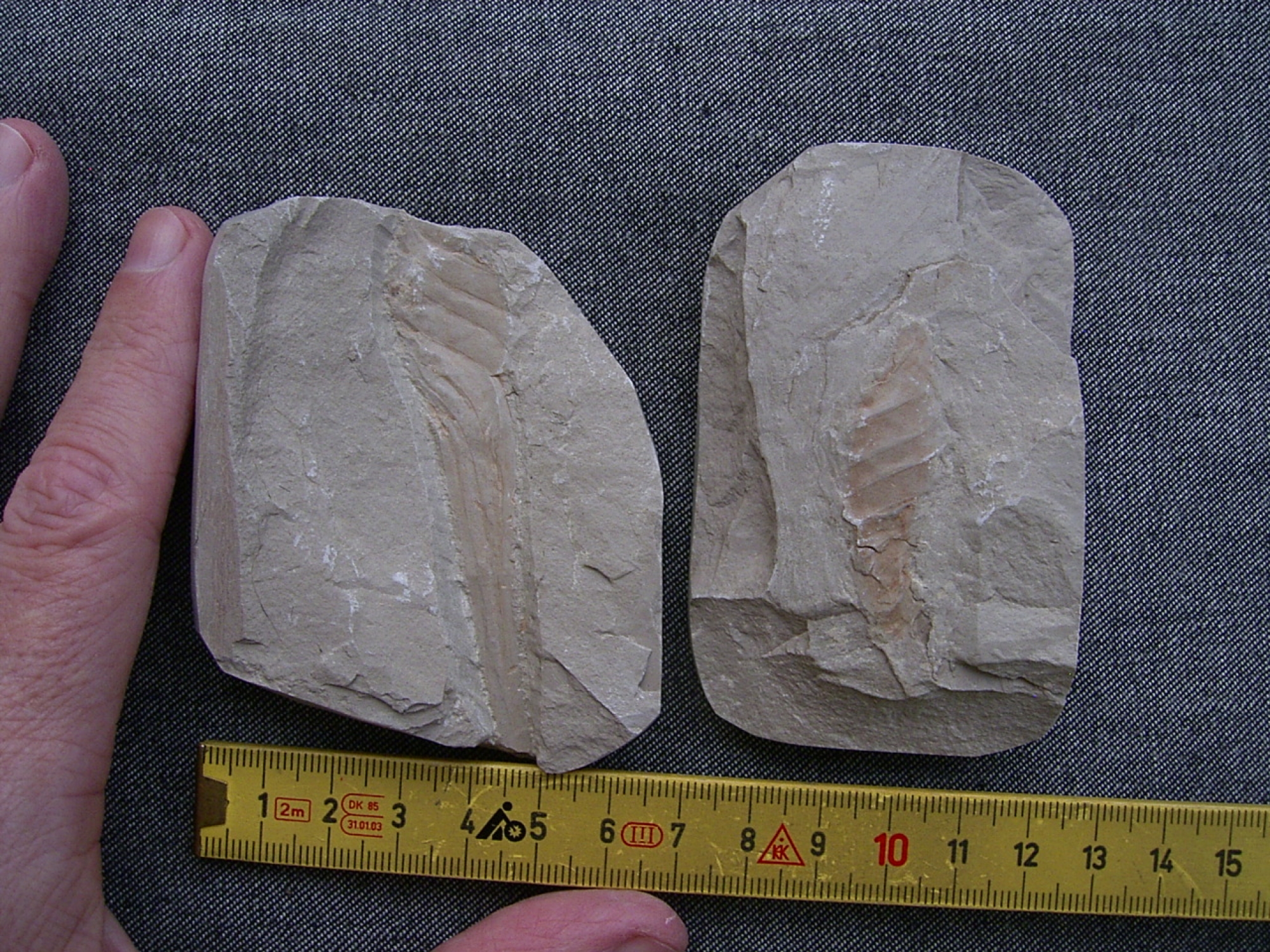 Postiv- und Negativseite des Fossils sind vorhanden. Die größte messbare Distanz am Fossil beträgt etwa 8,5 cm.