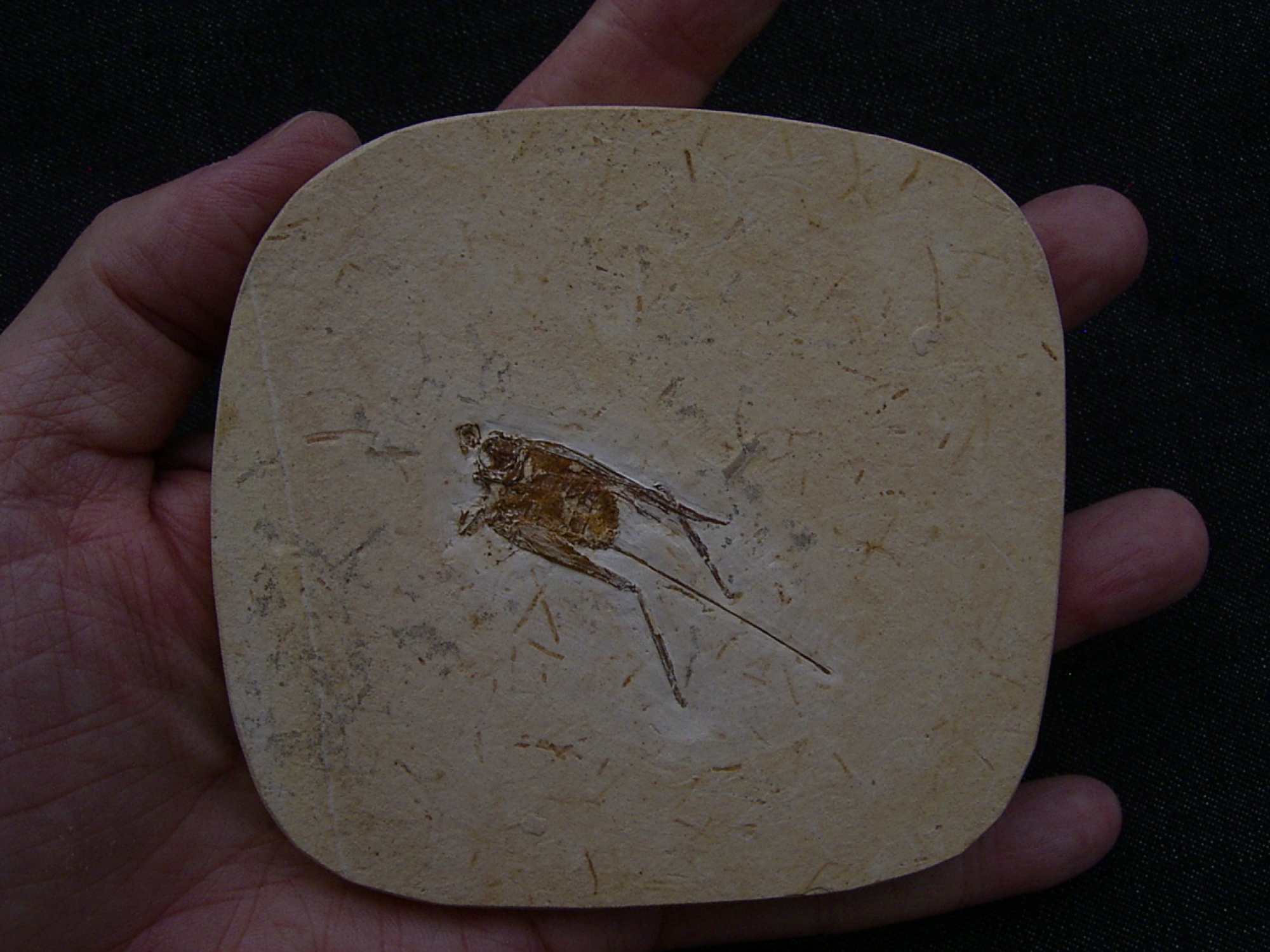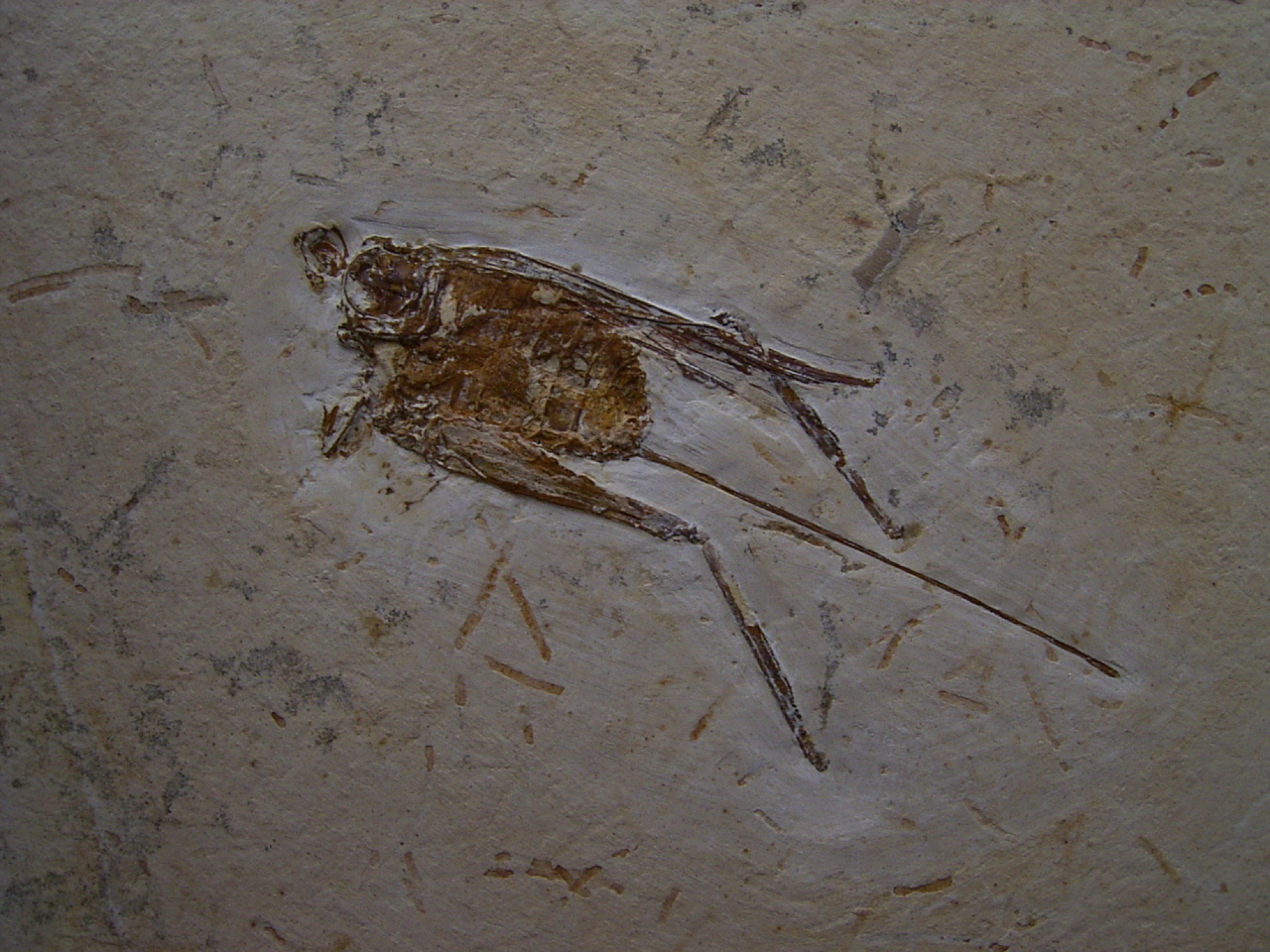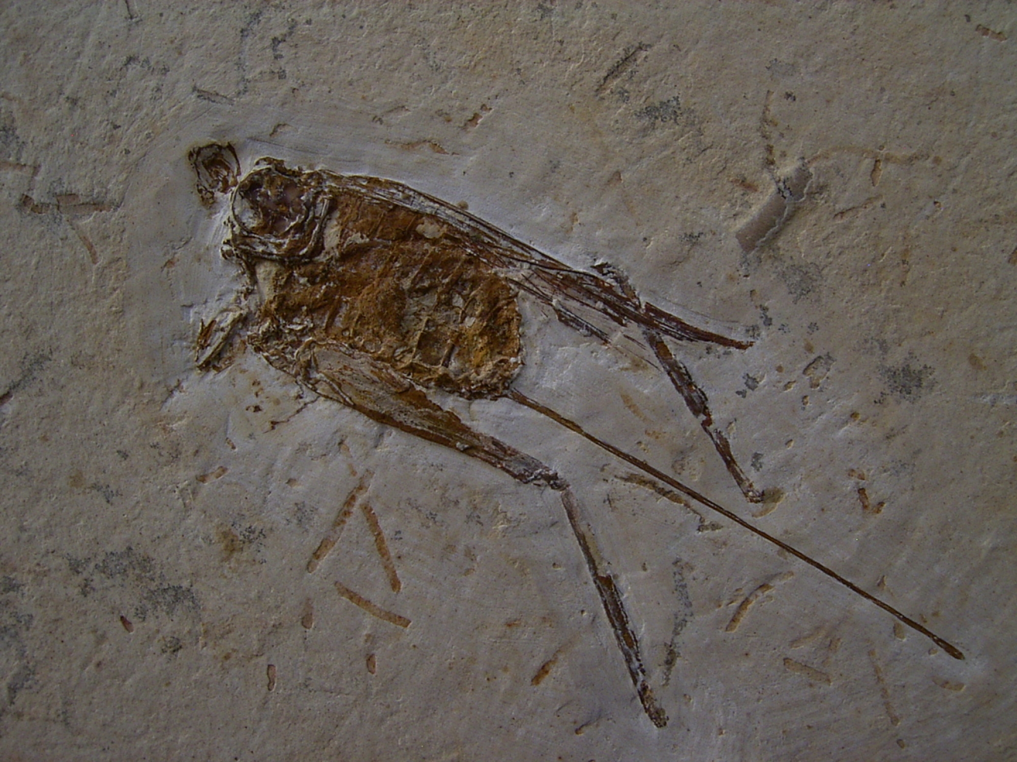 Dieses Fossil eines Grasüpfers stammt aus der unteren Kreide (Crato Formation - Santana Formation) von Nova Olinda (Araripe Becken) von Brasilien. Das Alter dieses Fossiles beläuft sich auf etwa 125 Mio. Jahre.