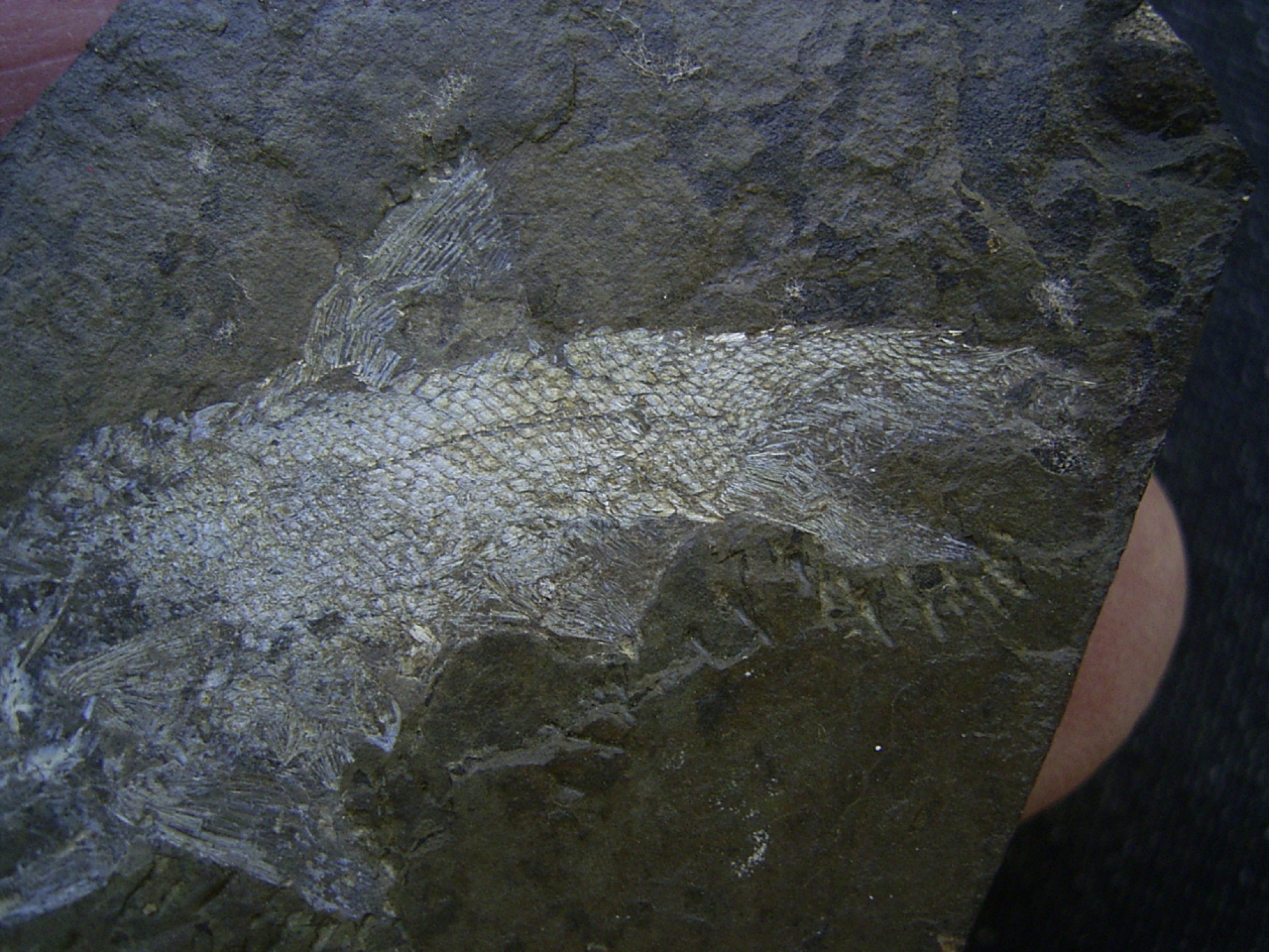 Dieser versteinerte Fisch Elonichthys stammt aus dem Perm (Schwarzpelit Bank) von Morsbacherhof in der Pfalz.
