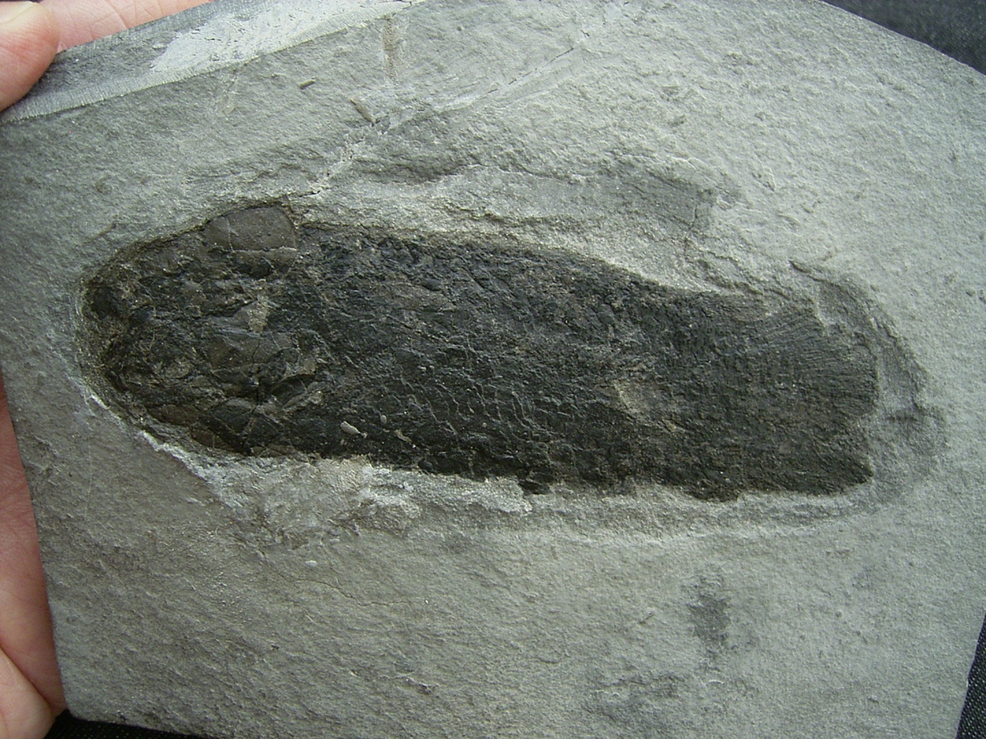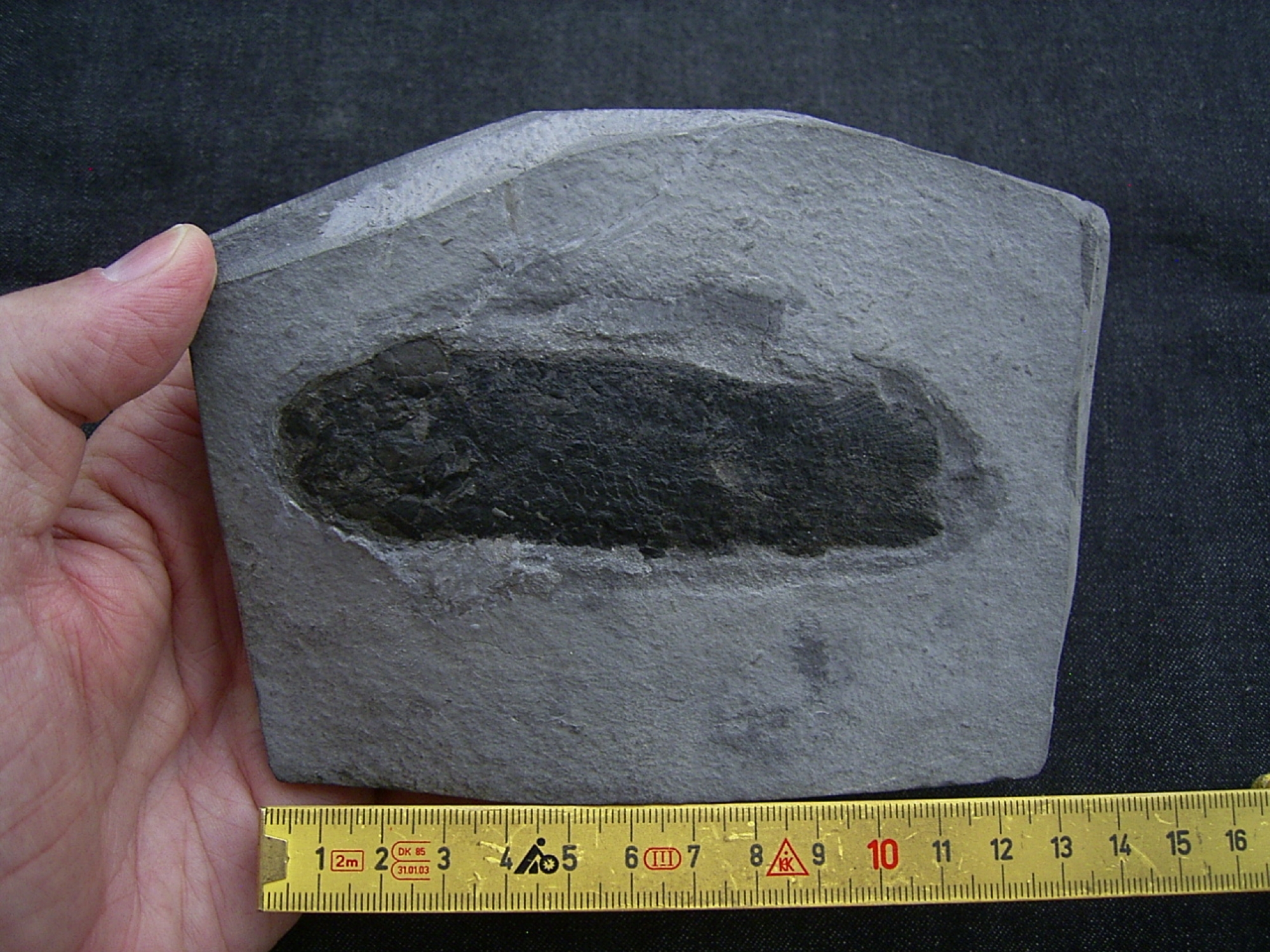 Der Fisch misst etwa 10,5 cm. Der Stein war einmal gebrochen, er misst etwa 15 x 11 x 2 cm.