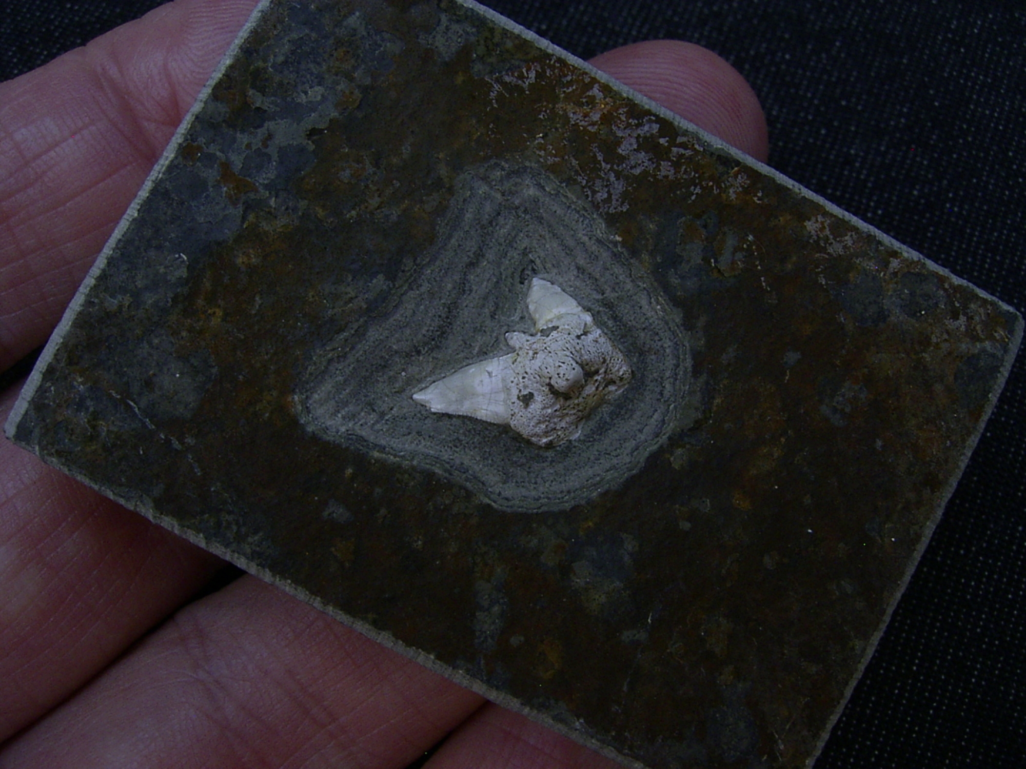 Der Zahn ist komplett, er ist dreidimensional erhalten und erhebt sich deutlich aus der Platte. An den Seiten ist die typisch gezackte Zahnstruktur gut zu erkennen.