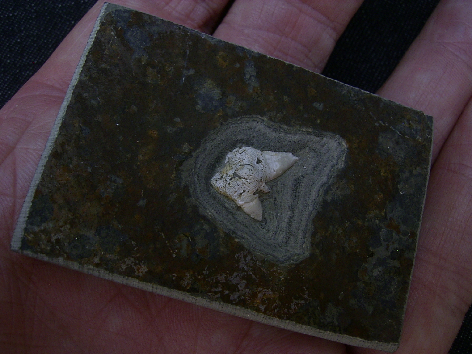 Das Fossil misst etwa 1,5 cm. Der Stein ist ungebrochen und misst etwa 5,5 x 4 cm x 0,8 cm.