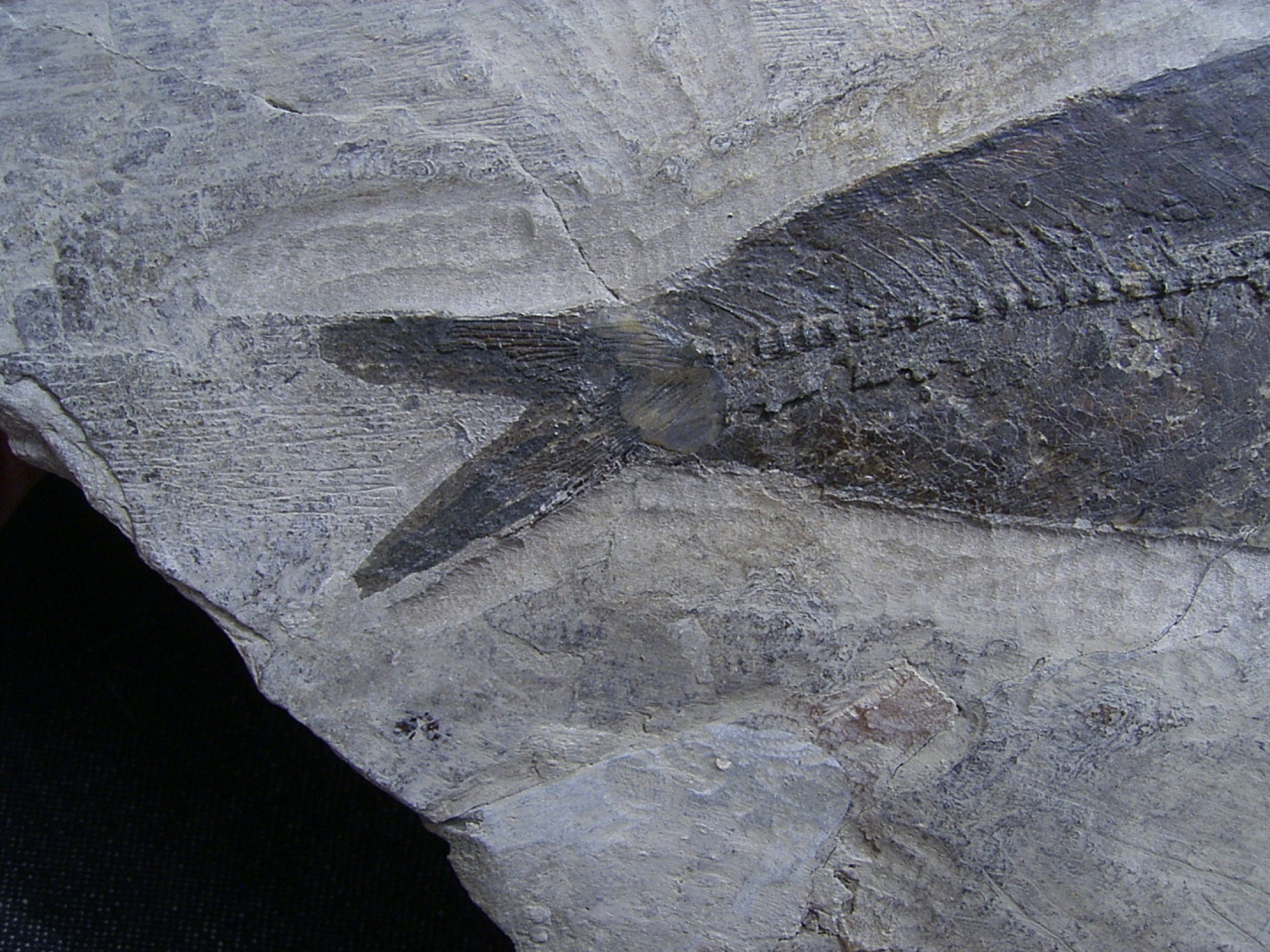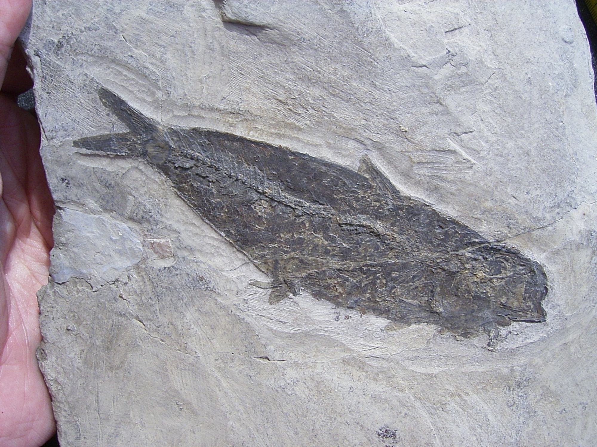 Viele Sammler kennen sicherlich die kleinen umgebetteten Heringe und Seenadeln von dieser Fundstelle - sie wurden frueher massenhaft angeboten. Ein solch grosser (und noch nicht identifizierter) Fisch und im Originalstein befindlicher wie der hier angebotene ist eine absolute Raritaet!