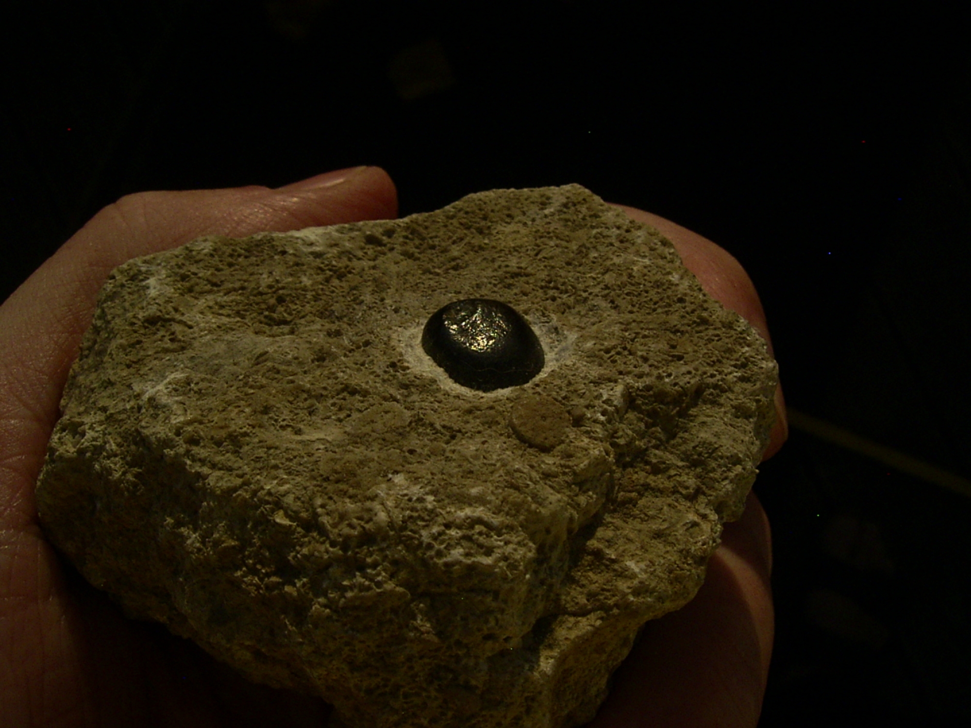 Dieser Zahn vom Pflasterzahn-Saurier Placodus gigas stammt aus der Mittleltrias (Muschelkalk) von Bindlach bei Bayreuth.