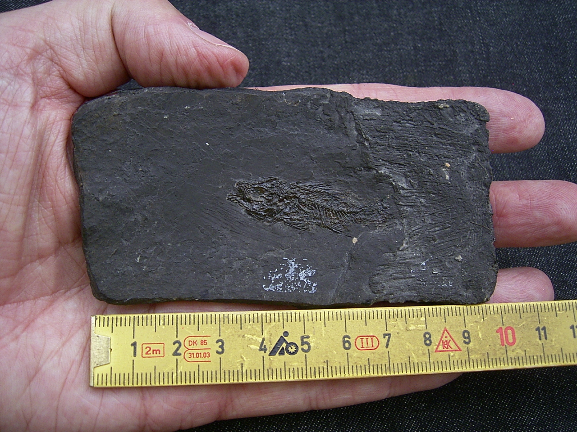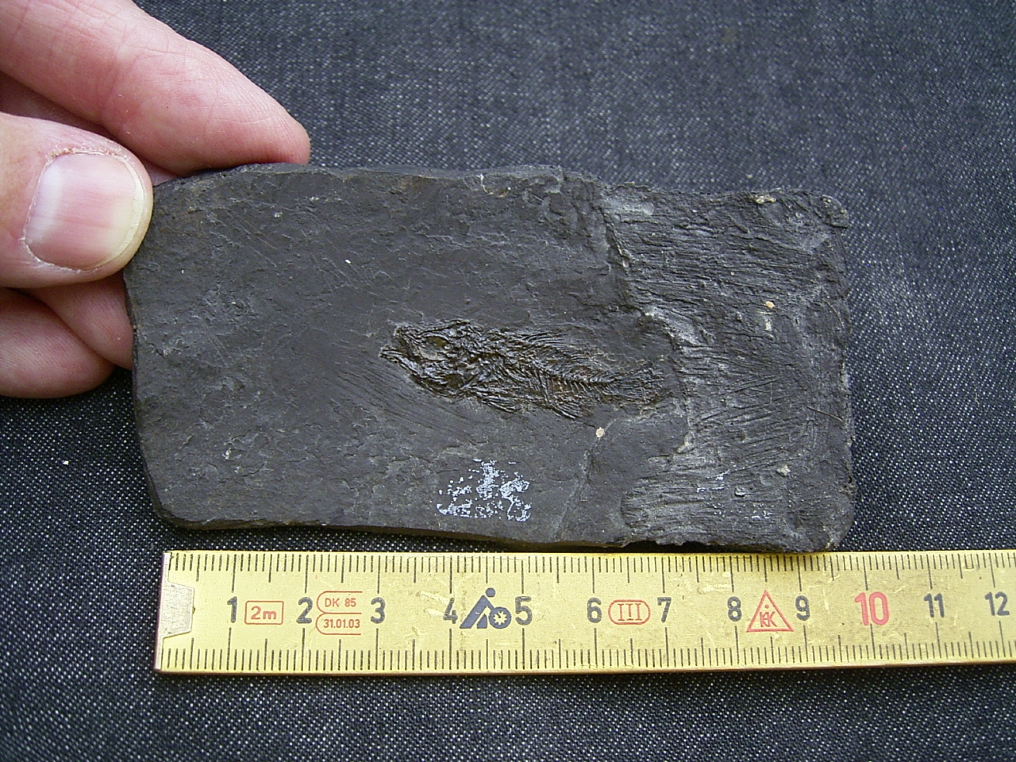 Die Fisch ist toll erhalten und zeigt viele Details. Er misst etwa 4 cm. Die ungebrochene Platte misst etwa 9,5 x 5 cm.