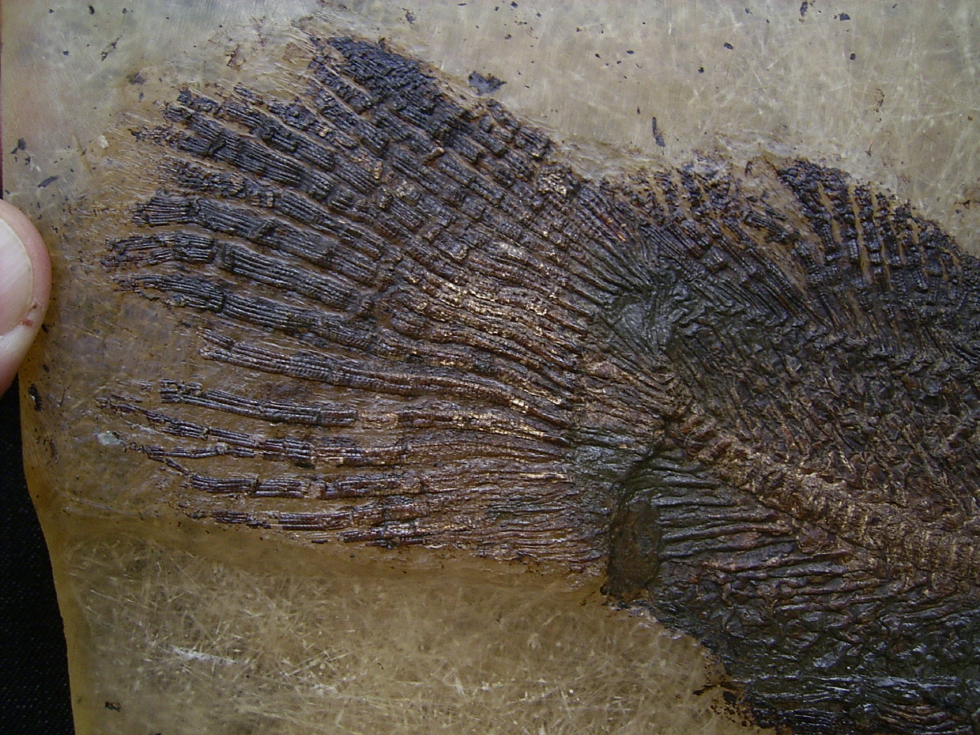 - Perfekte Transferpraeparation: Aufgrund der Beschaffenheit des Messeler Oelschiefers wurde dieses Stueck fachgerecht auf eine Kunstharzplatte (Transfermethode) uebertragen. Dies garantiert die dauerhafte Stabilitaet und Haltbarkeit des Exponats.