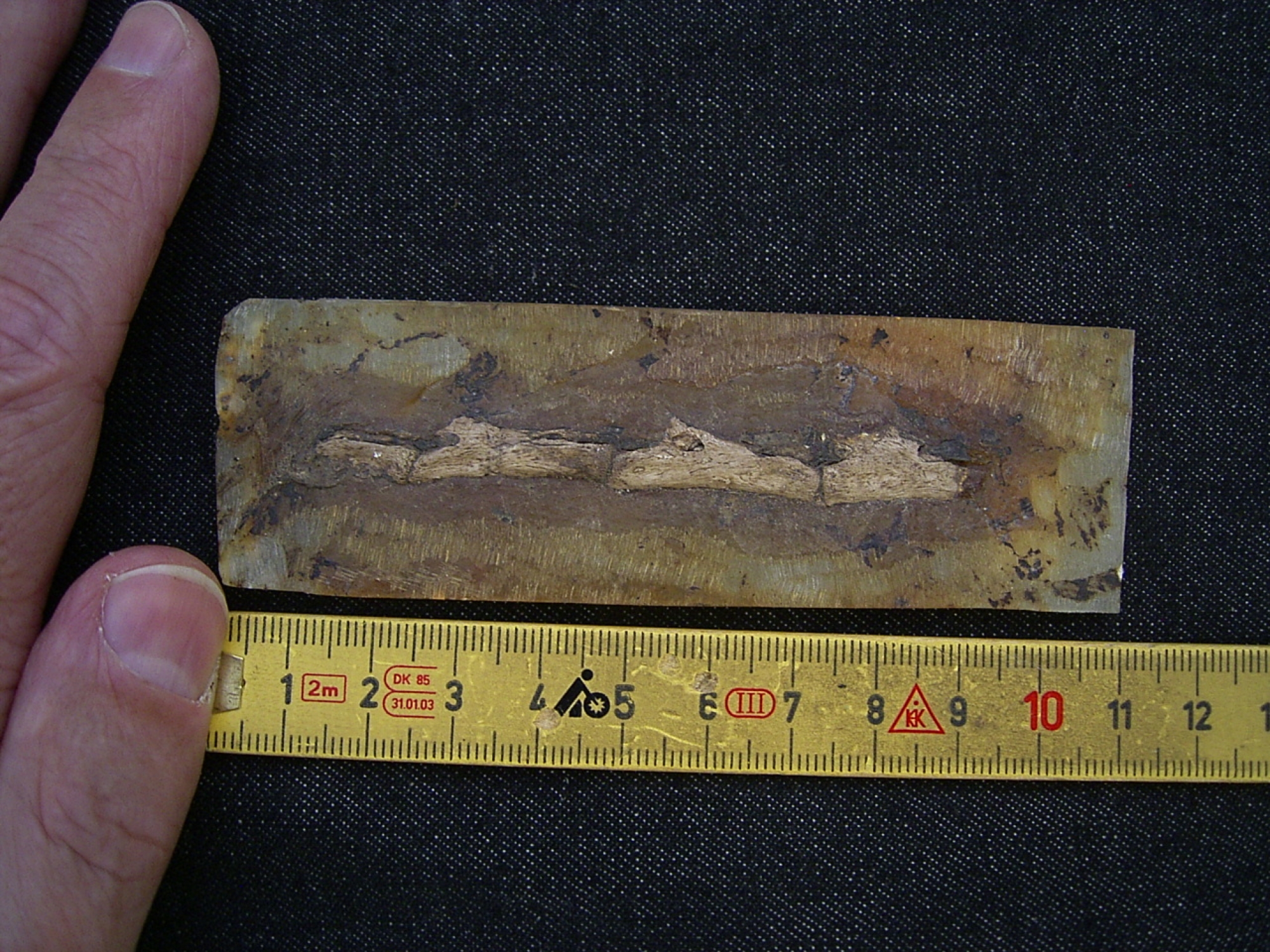 The fossil measures approximately 8 cm. The slab is unbroken and measures approximately 11 x 3.5 x 0.5 cm.