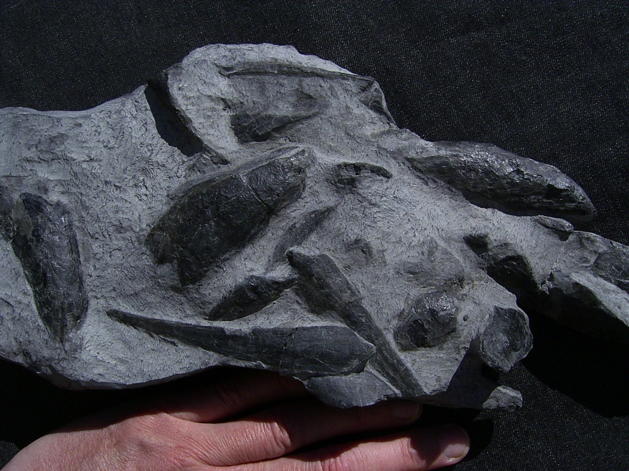Der Stein misst etwa 38 x 15 cm. Er enthält viele Fossilien wie Kopfschilde, Rostren, Stacheln und so weiter.